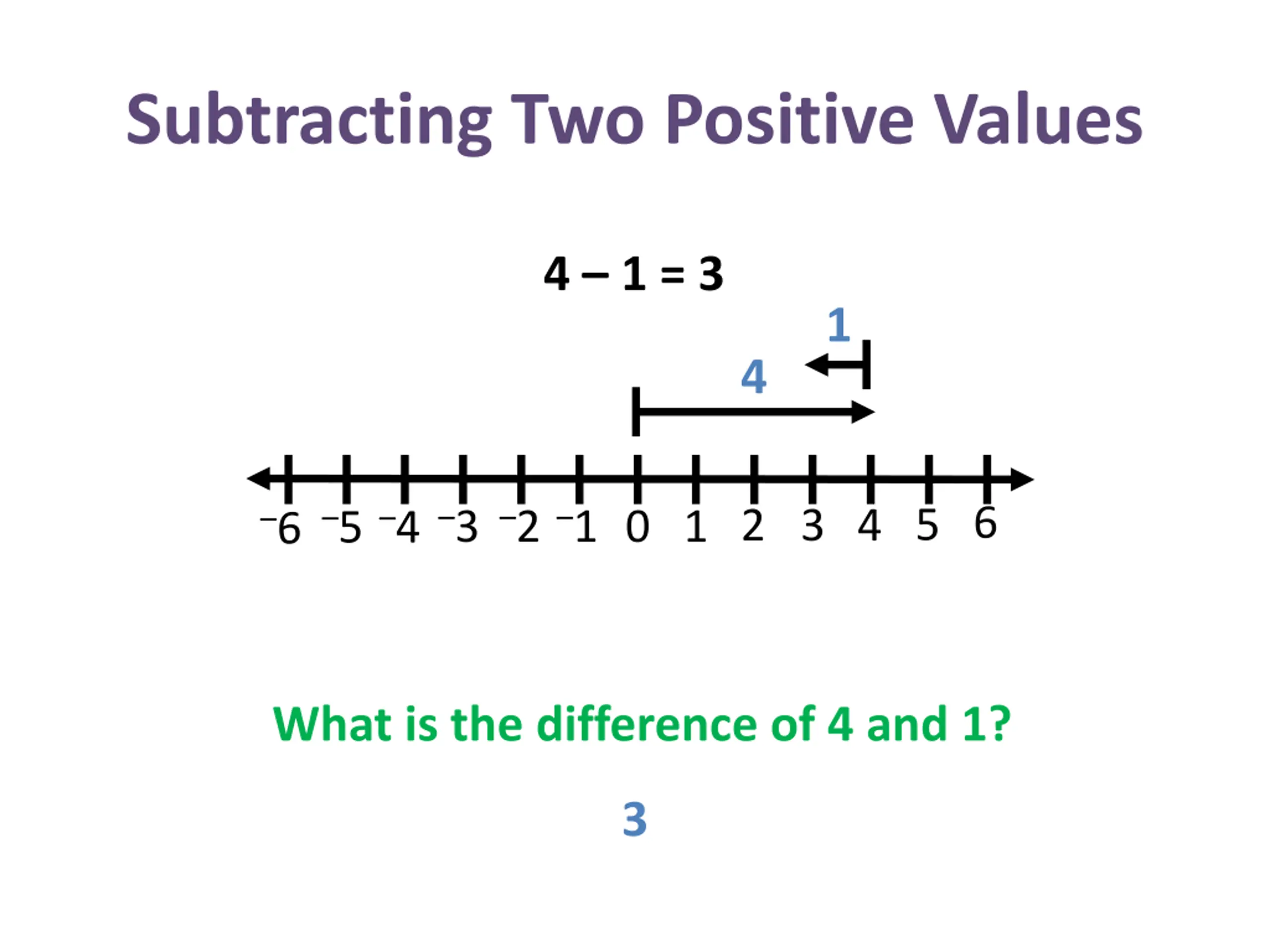 Subtracting Two Positive Values 4 1 = 3 1 4 3 4 5 6 3 2 1 4 5 2 6 1 0 What is the difference of 4 and 1? 3