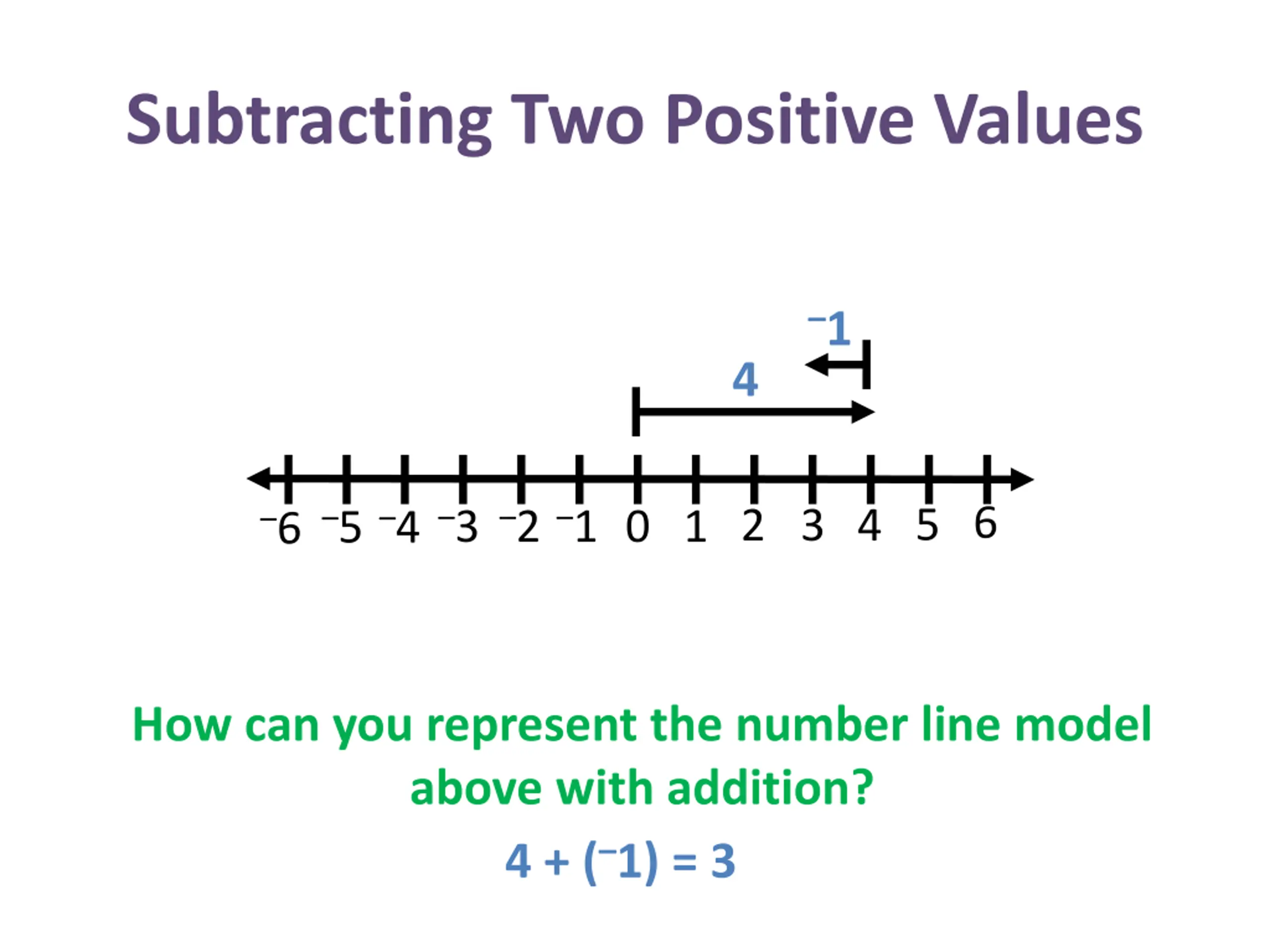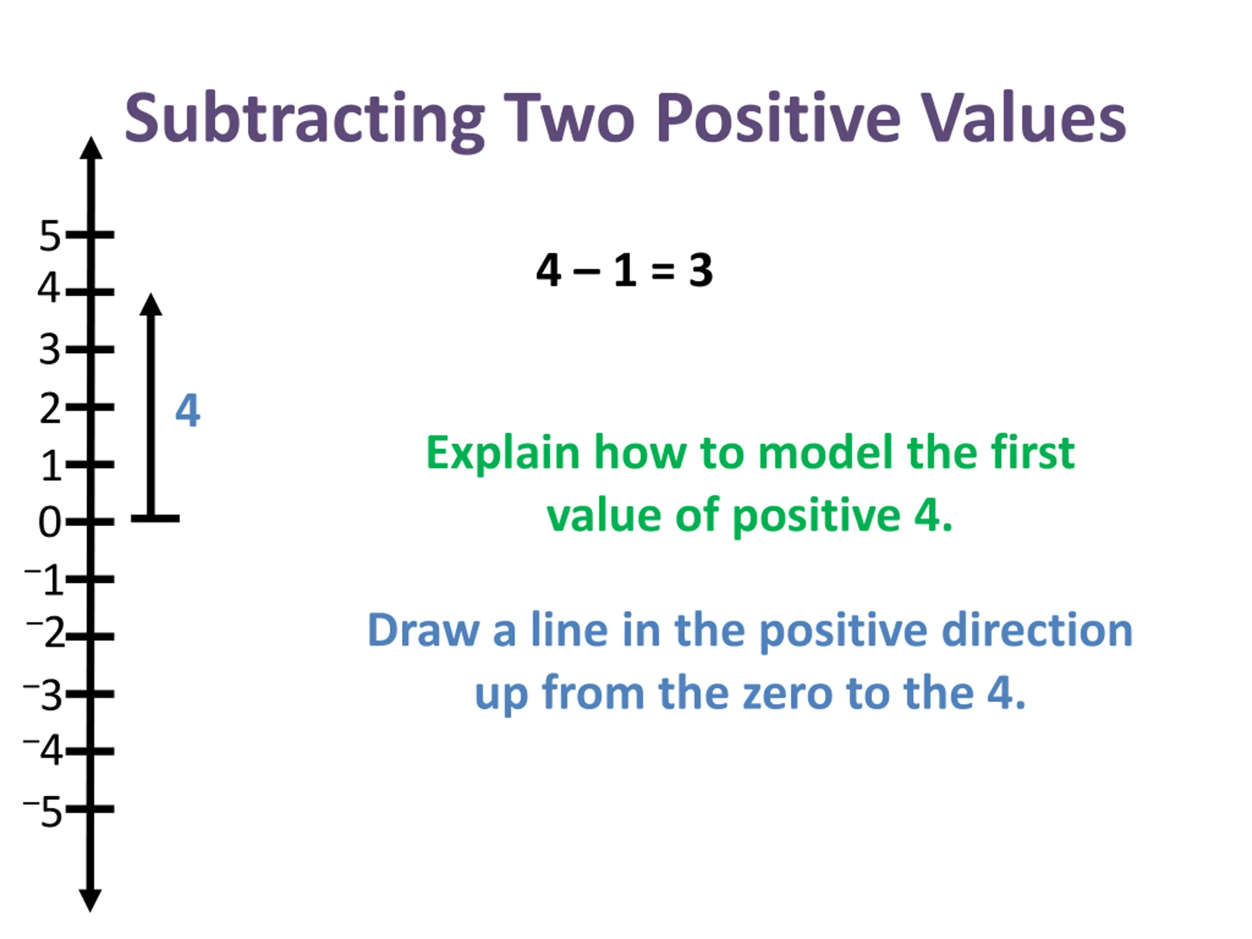 Subtracting Two Positive Values 5 4 1 = 3 4 3 2 1 0 4 Explain how to model the first value of positive 4. 1 2 3 4 5 Draw a line in the positive direction up from the zero to the 4.