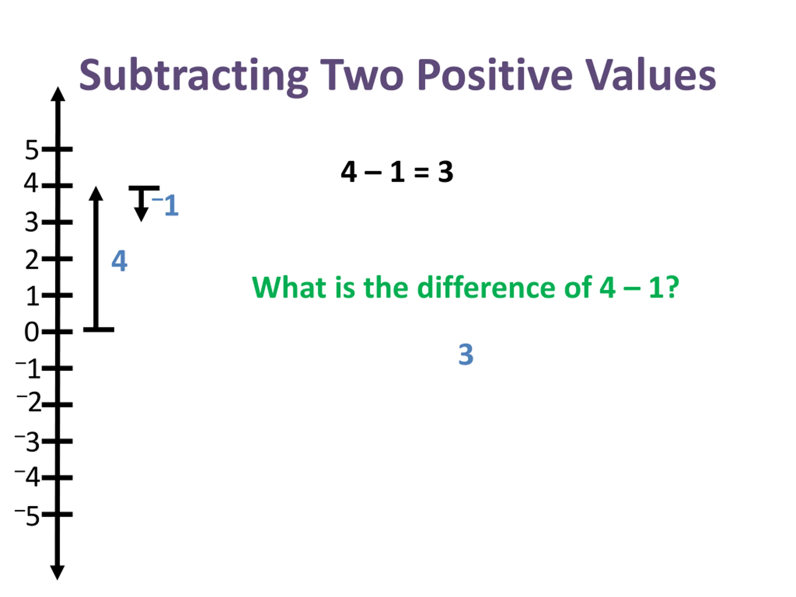 Subtracting Two Positive Values 5 4 1 = 3 4 1 3 2 1 0 4 What is the difference of 4 1? 3 1 2 3 4 5