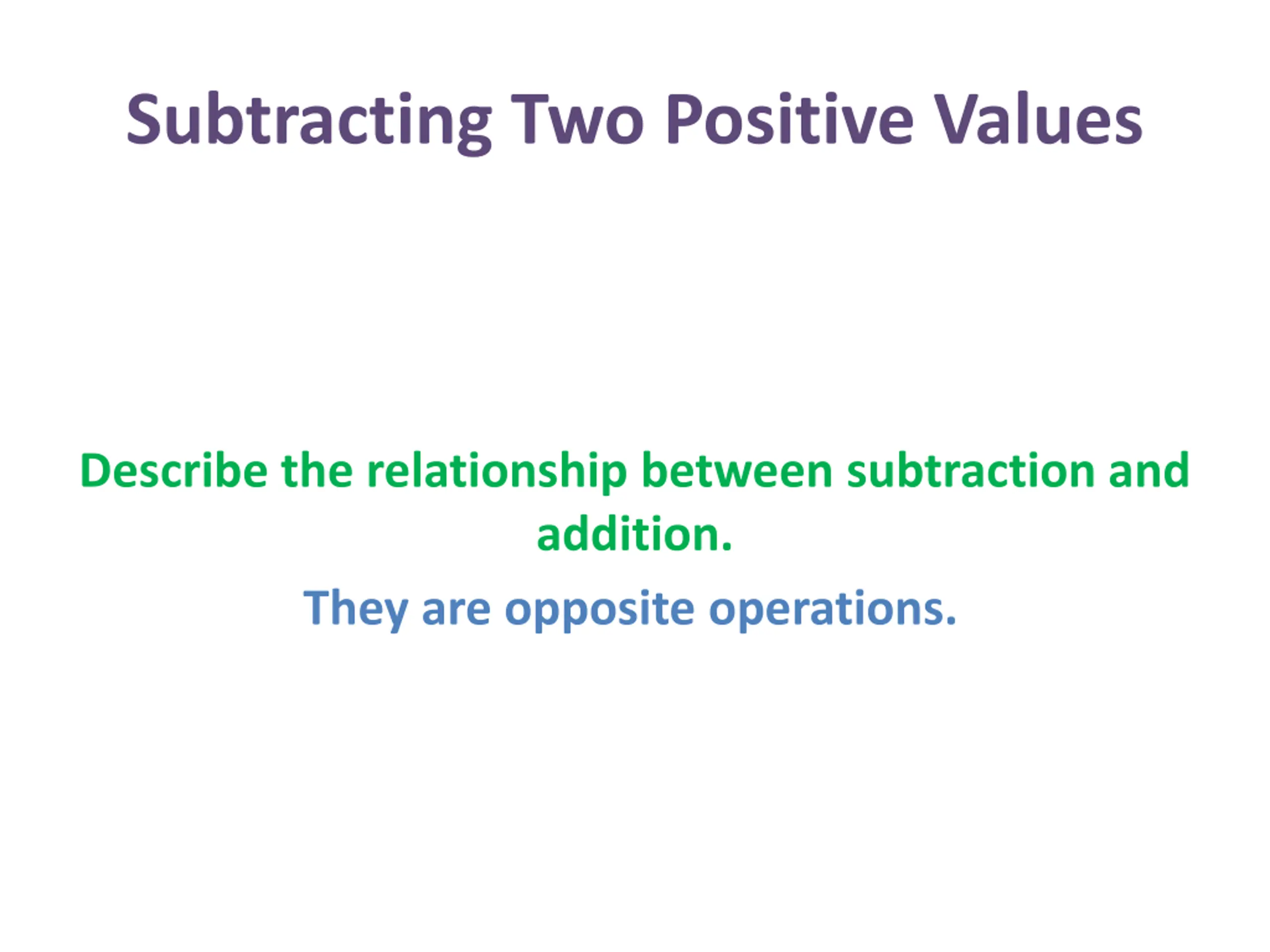 Subtracting Two Positive Values Describe the relationship between subtraction and addition. They are opposite operations.