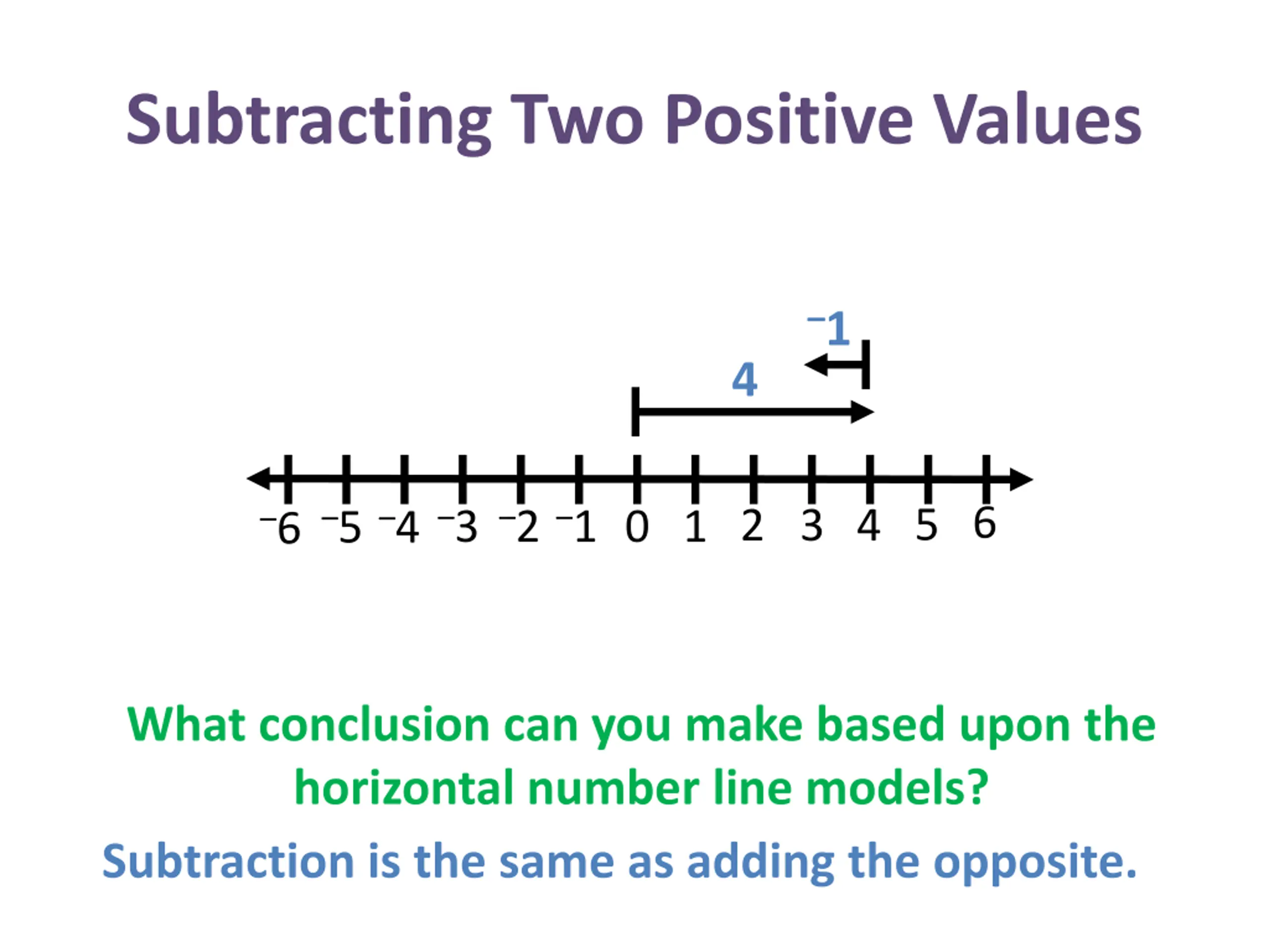 Subtracting Two Positive Values 1 4 3 4 5 6 3 2 1 4 5 2 6 1 0 What conclusion can you make based upon the horizontal number line models? Subtraction is the same as adding the opposite.