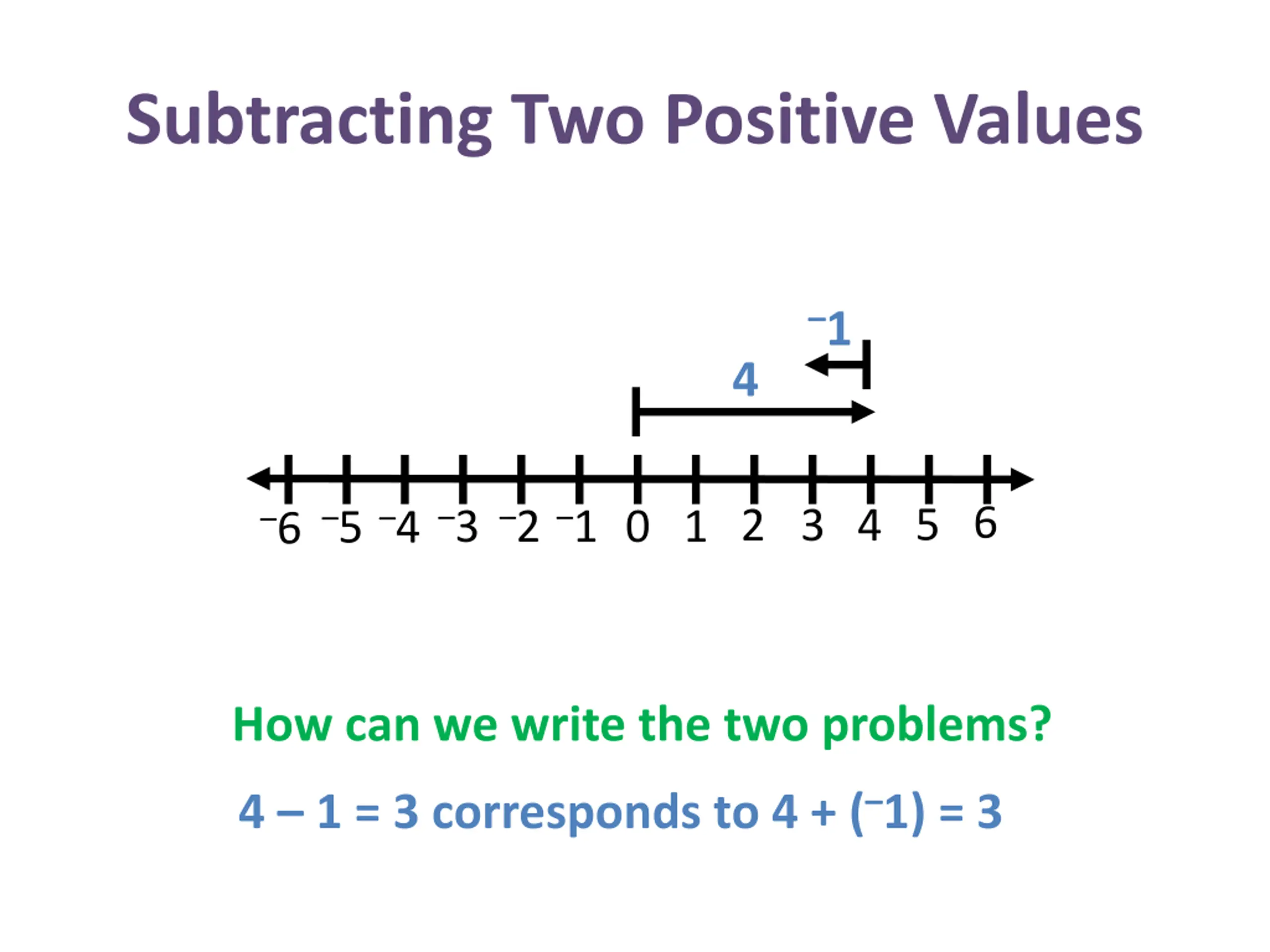 Subtracting Two Positive Values 1 4 3 4 5 6 3 2 1 4 5 2 6 1 0 How can we write the two problems? 4 1 = 3 corresponds to 4 + ( 1) = 3
