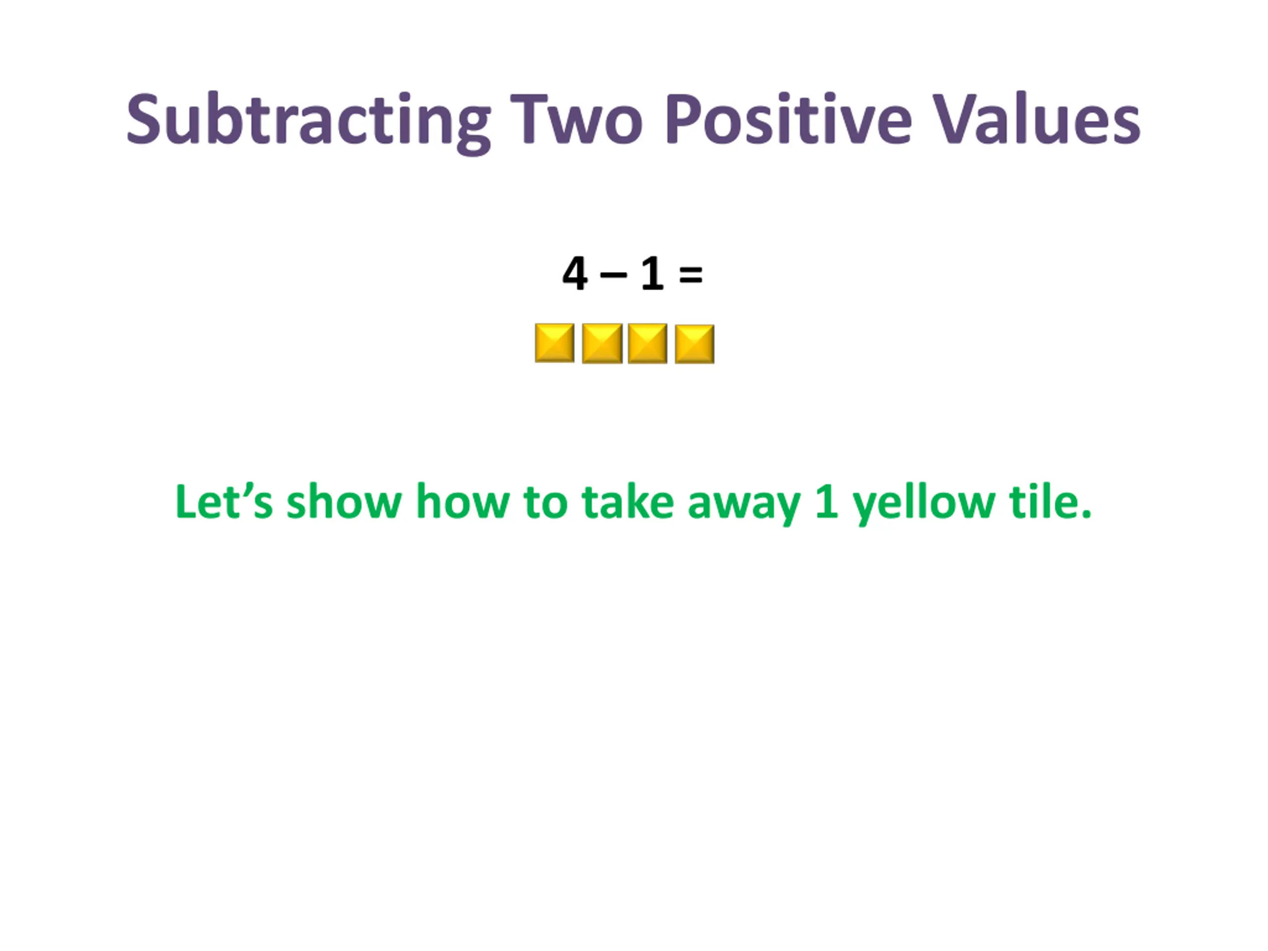 Subtracting Two Positive Values 4 1 = Let s show how to take away 1 yellow tile.
