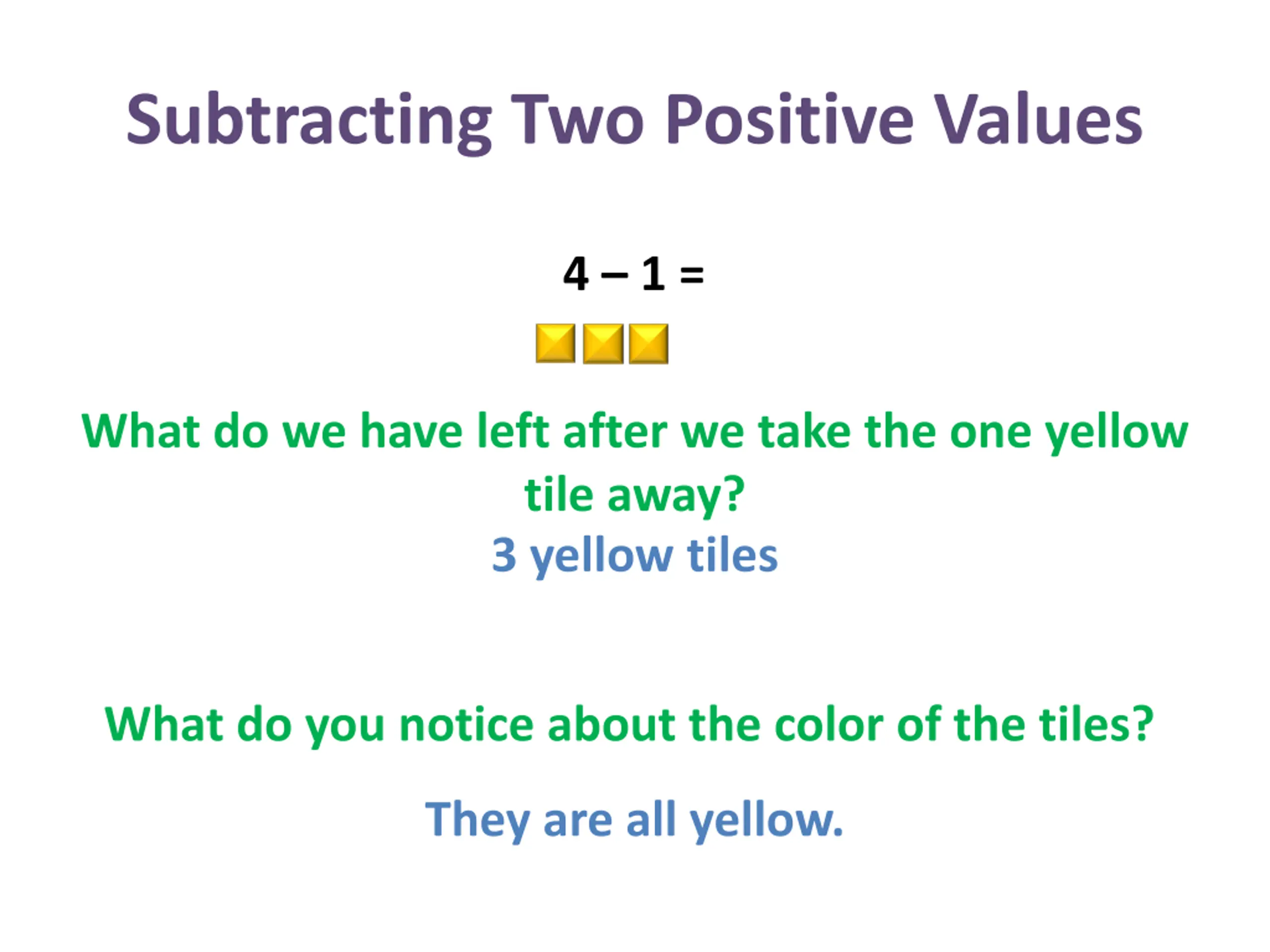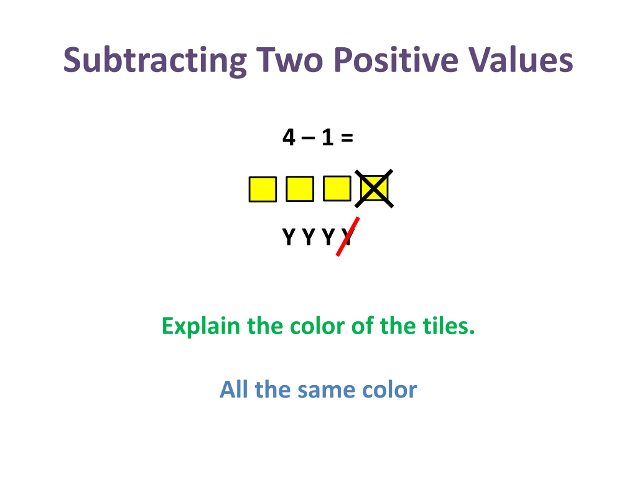 Subtracting Two Positive Values 4 1 = Y Y Y Y Explain the color of the tiles. All the same color
