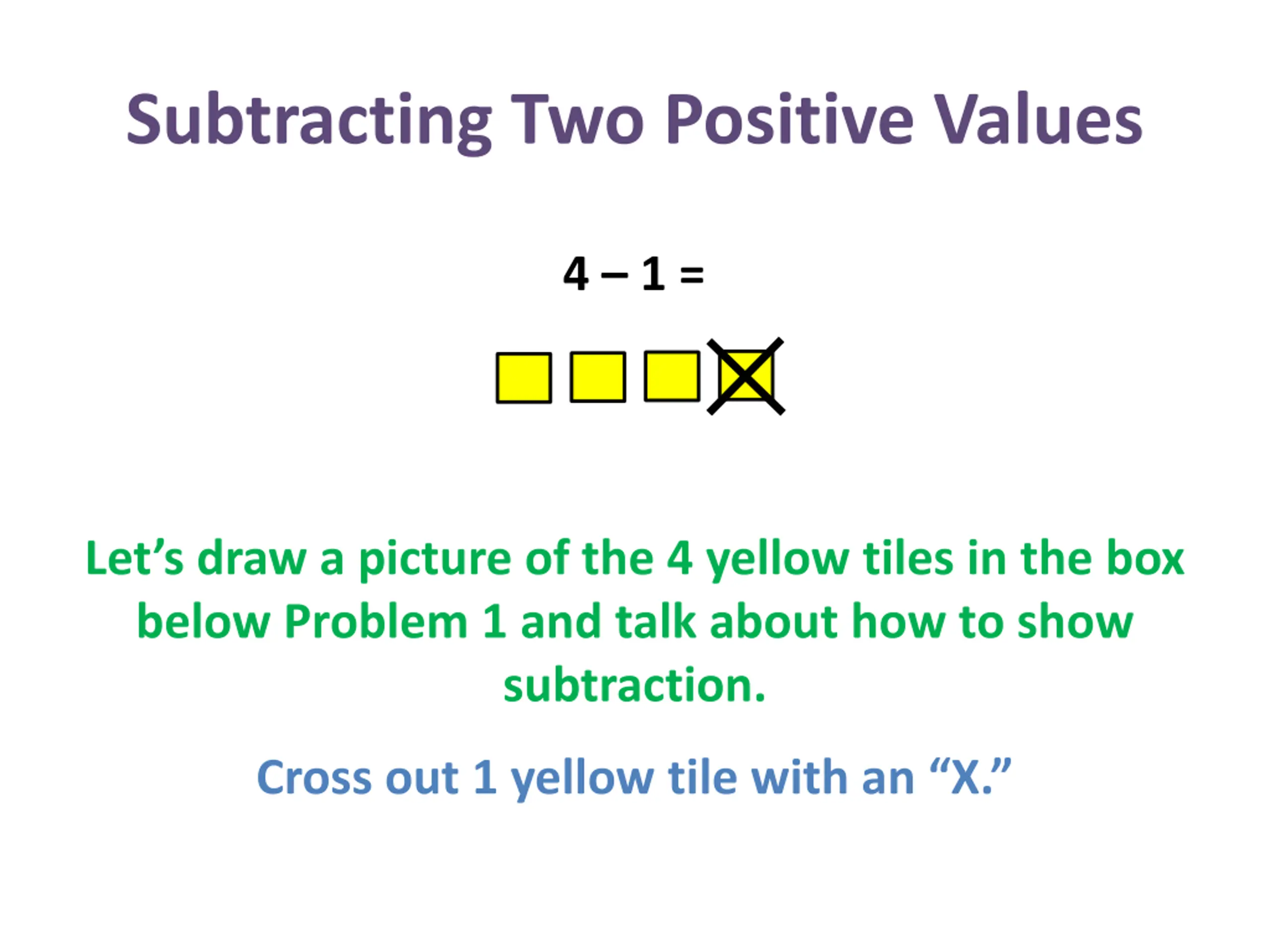 Subtracting Two Positive Values 4 1 = Let s draw a picture of the 4 yellow tiles in the box below Problem 1 and talk about how to show subtraction. Cross out 1 yellow tile with an X.