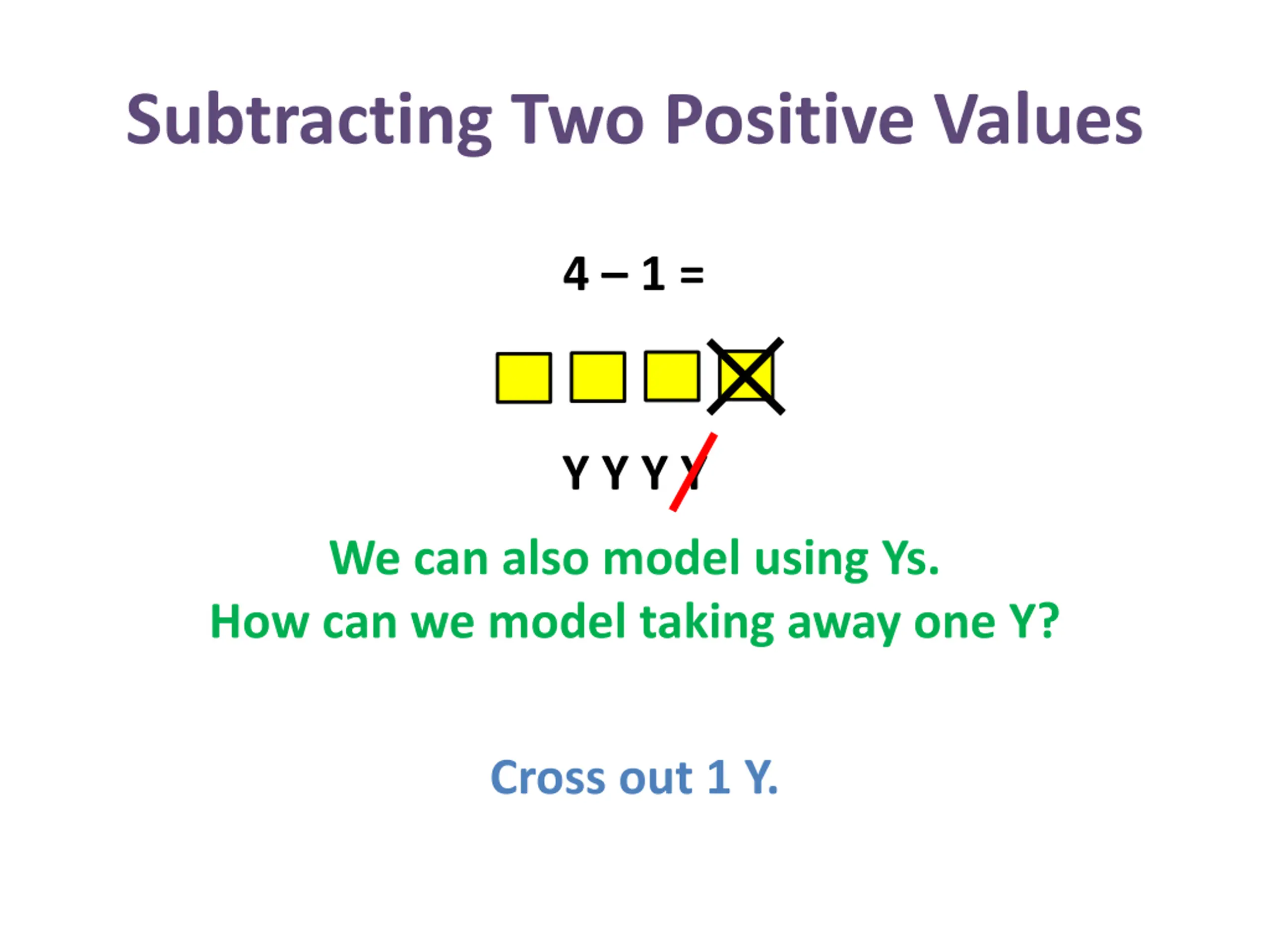 Subtracting Two Positive Values 4 1 = Y Y Y Y We can also model using Ys. How can we model taking away one Y? Cross out 1 Y.
