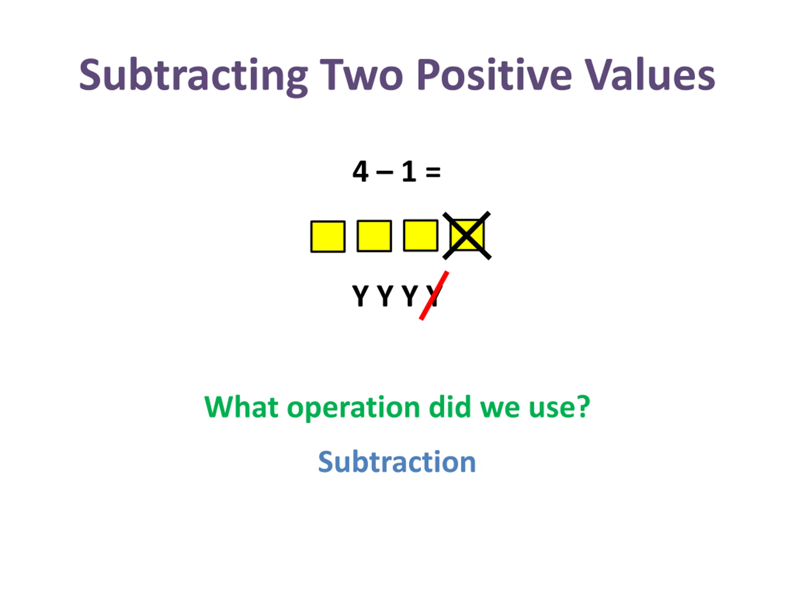 Subtracting Two Positive Values 4 1 = Y Y Y Y What operation did we use? Subtraction
