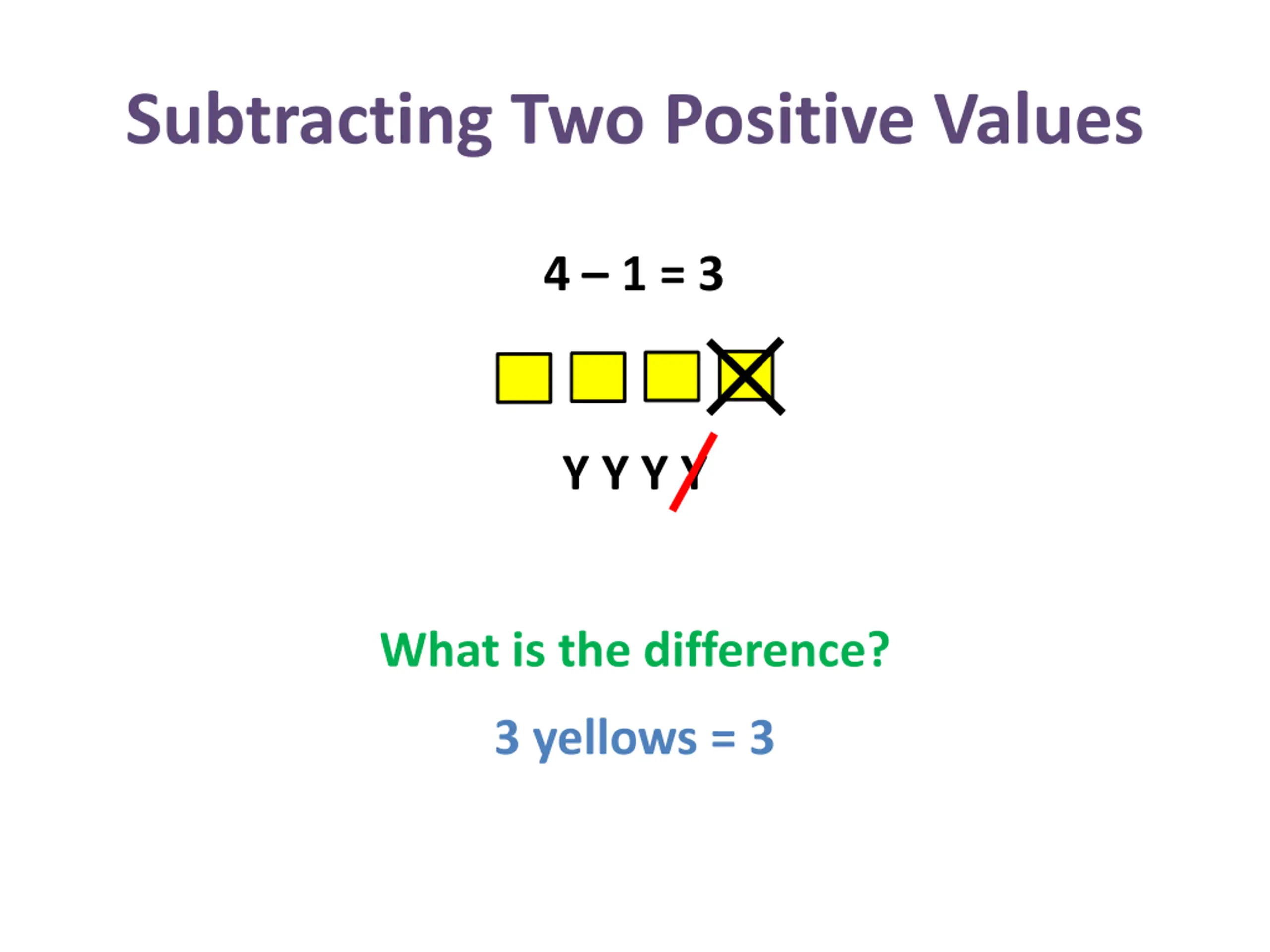Subtracting Two Positive Values 4 1 = 3 Y Y Y Y What is the difference? 3 yellows = 3