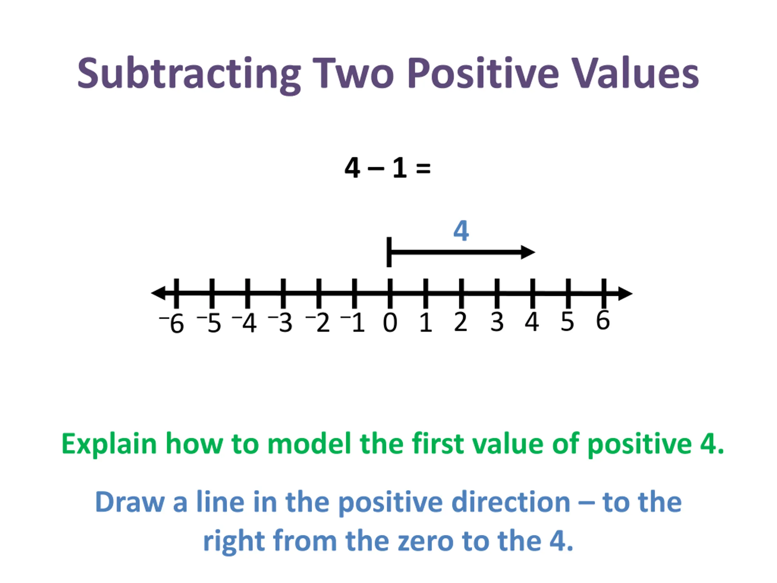 Subtracting Two Positive Values 4 1 = 4 3 4 5 6 3 2 1 4 5 2 6 1 0 Explain how to model the first value of positive 4. Draw a line in the positive direction to the right from the zero to the 4.