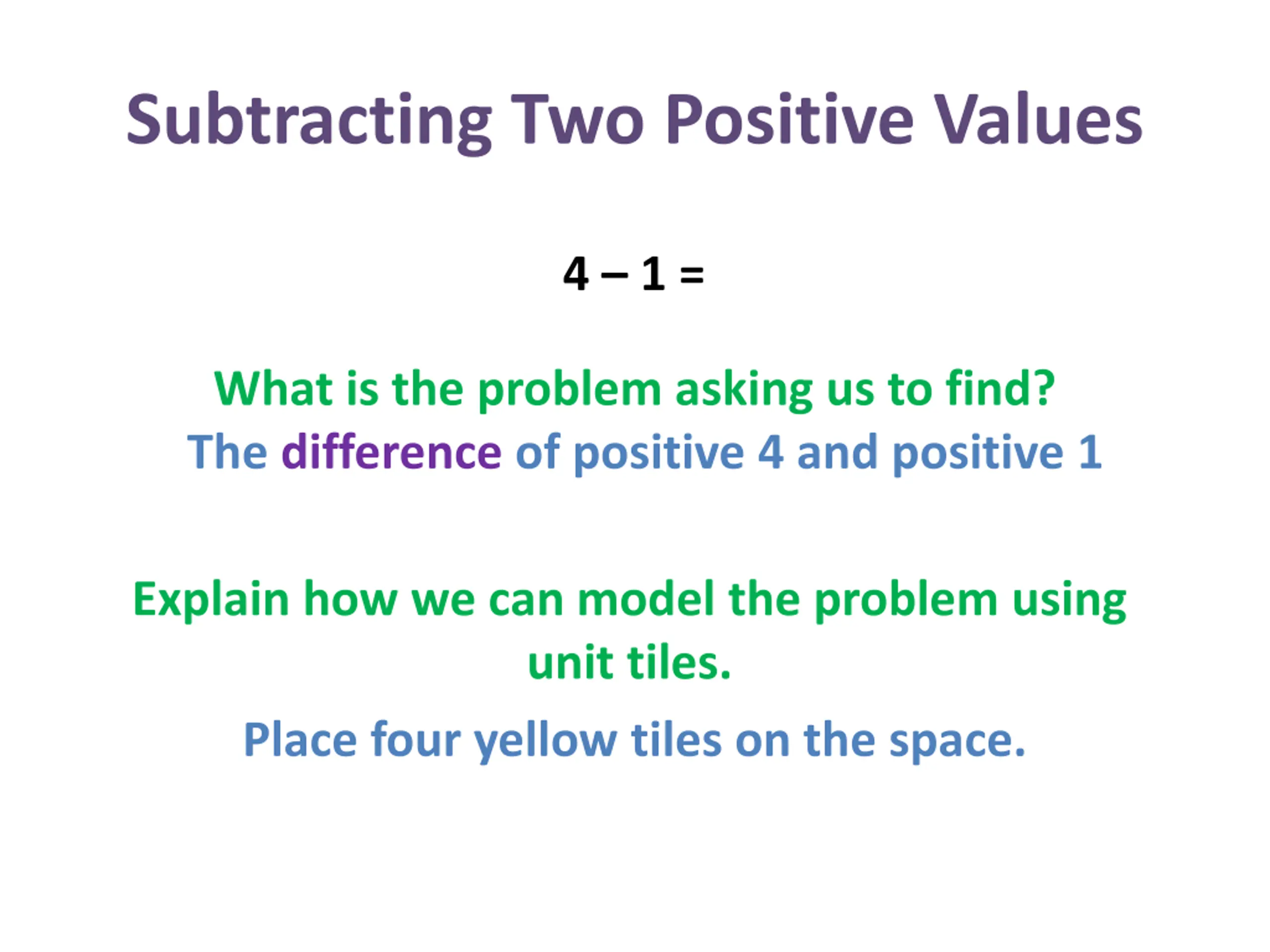 Subtracting Two Positive Values 4 1 = What is the problem asking us to find? The difference of positive 4 and positive 1 Explain how we can model the problem using unit tiles. Place four yellow tiles on the space.