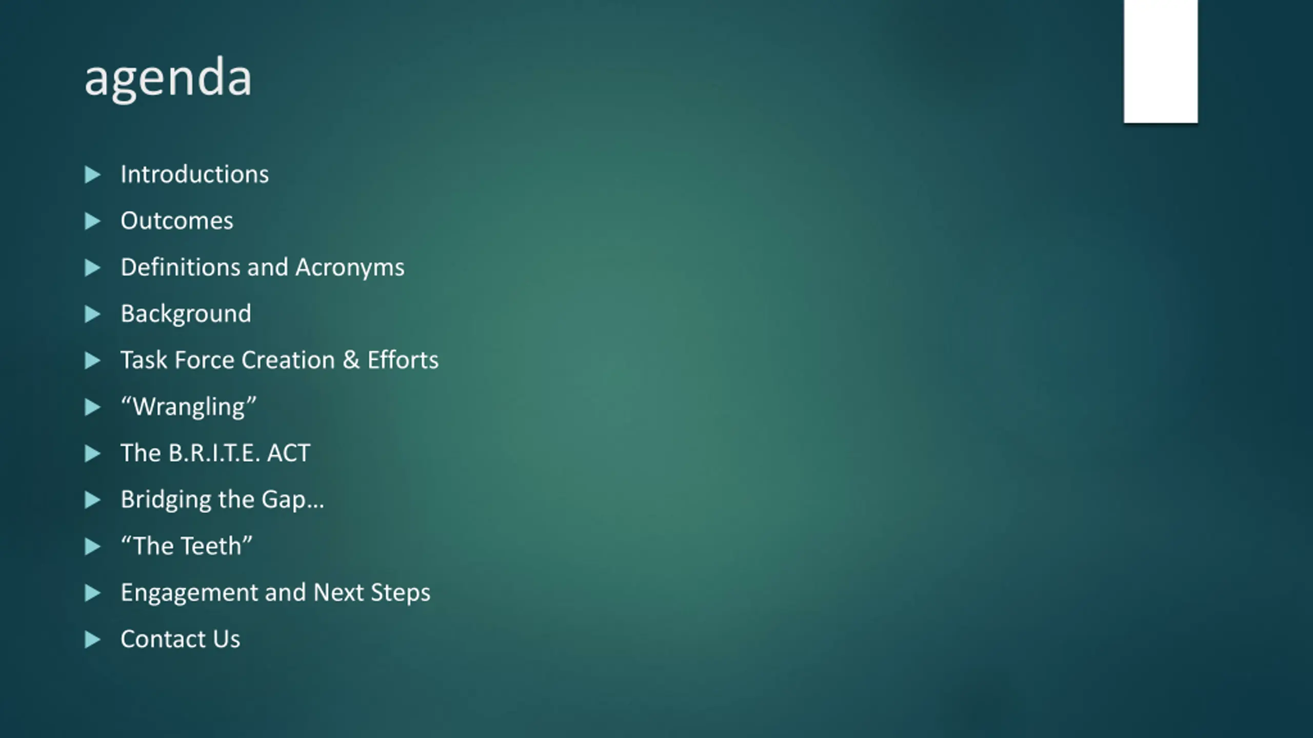 agenda Introductions Outcomes Definitions and Acronyms Background Task Force Creation & Efforts Wrangling The B.R.I.T.E. ACT Bridging the Gap The Teeth Engagement and Next Steps Contact Us