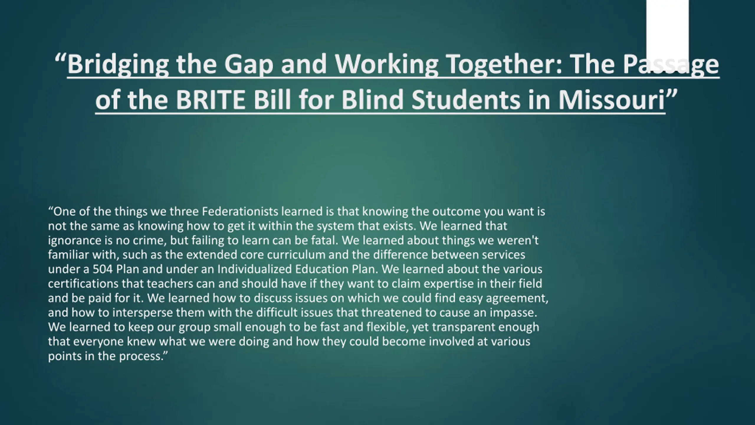 Bridging the Gap and Working Together: The Passage of the BRITE Bill for Blind Students in Missouri One of the things we three Federationists learned is that knowing the outcome you want is not the same as knowing how to get it within the system that exists. We learned that ignorance is no crime, but failing to learn can be fatal. We learned about things we weren't familiar with, such as the extended core curriculum and the difference between services under a 504 Plan and under an Individualized Education Plan. We learned about the various certifications that teachers can and should have if they want to claim expertise in their field and be paid for it. We learned how to discuss issues on which we could find easy agreement, and how to intersperse them with the difficult issues that threatened to cause an impasse. We learned to keep our group small enough to be fast and flexible, yet transparent enough that everyone knew what we were doing and how they could become involved at various points in the process.