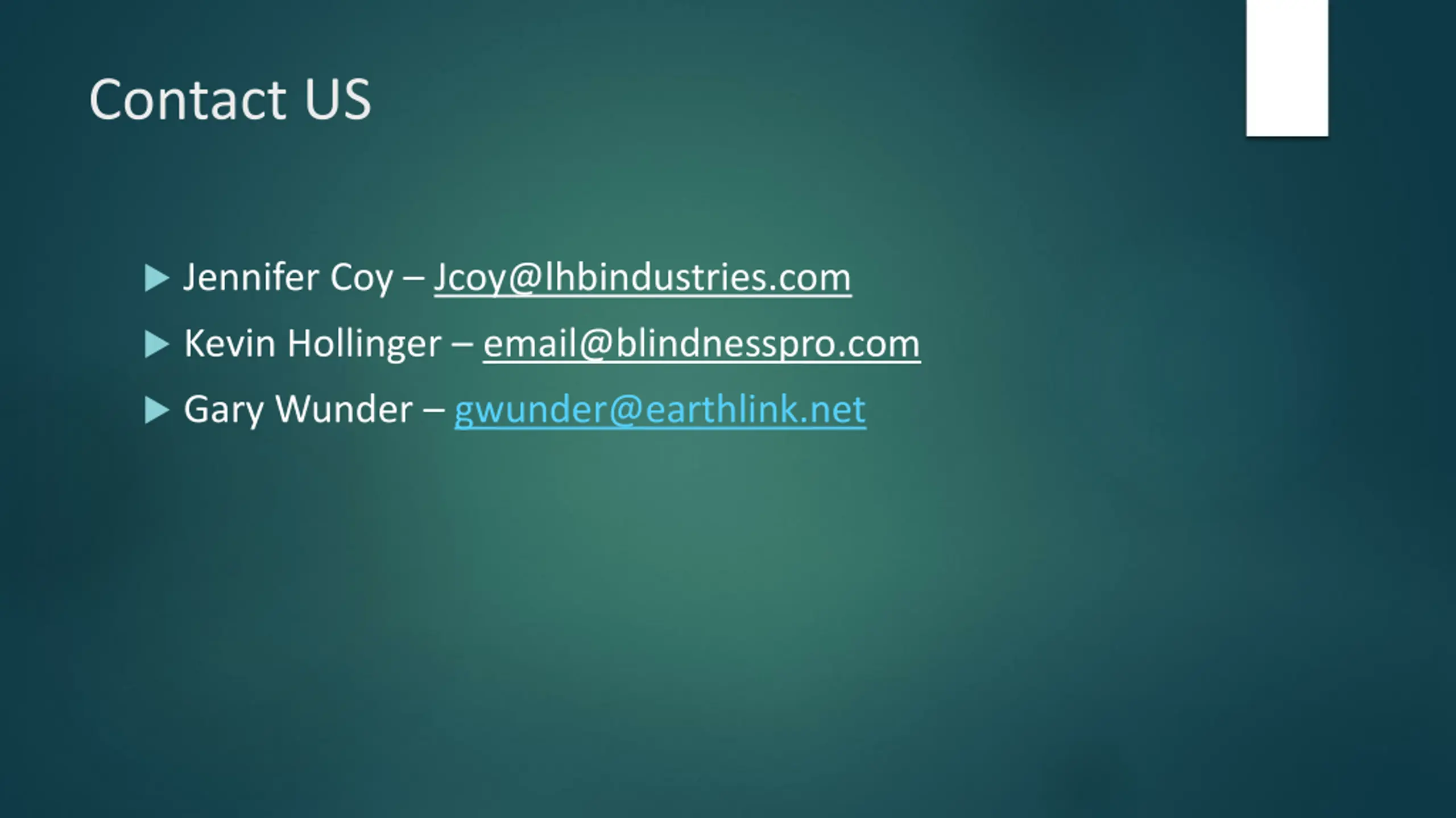 Contact US Jennifer Coy Jcoy@lhbindustries.com Kevin Hollinger email@blindnesspro.com Gary Wunder gwunder@earthlink.net