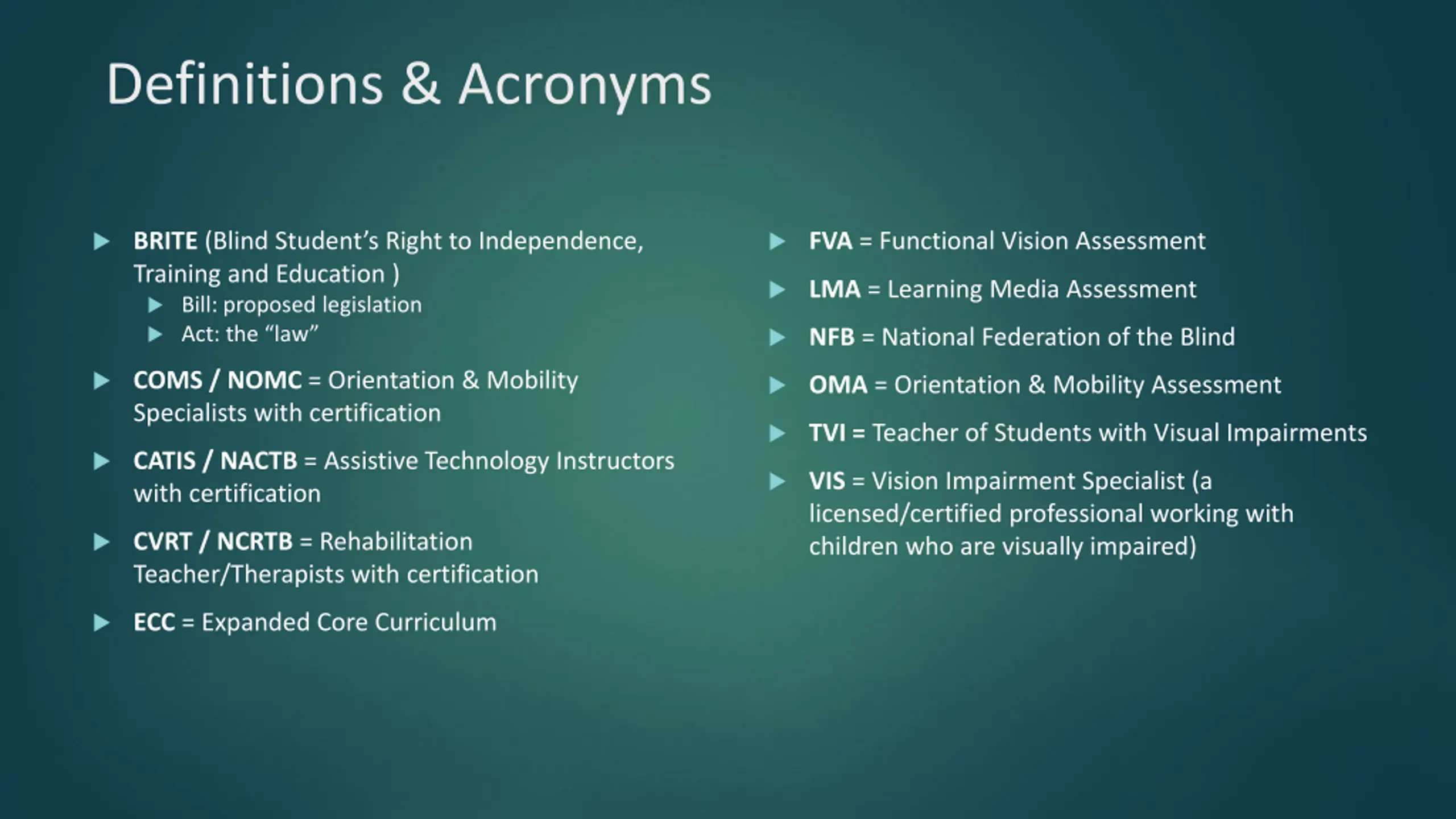 Definitions & Acronyms BRITE (Blind Student s Right to Independence, Training and Education ) Bill: proposed legislation Act: the law FVA = Functional Vision Assessment LMA = Learning Media Assessment NFB = National Federation of the Blind COMS / NOMC = Orientation & Mobility Specialists with certification OMA = Orientation & Mobility Assessment TVI = Teacher of Students with Visual Impairments CATIS / NACTB = Assistive Technology Instructors with certification VIS = Vision Impairment Specialist (a licensed/certified professional working with children who are visually impaired) CVRT / NCRTB = Rehabilitation Teacher/Therapists with certification ECC = Expanded Core Curriculum