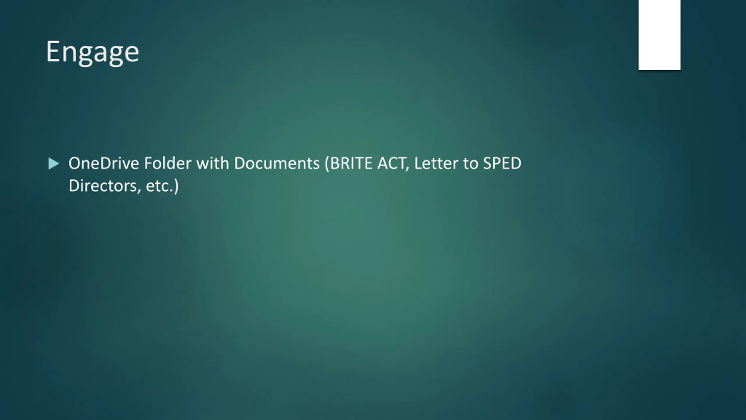 Engage OneDrive Folder with Documents (BRITE ACT, Letter to SPED Directors, etc.)
