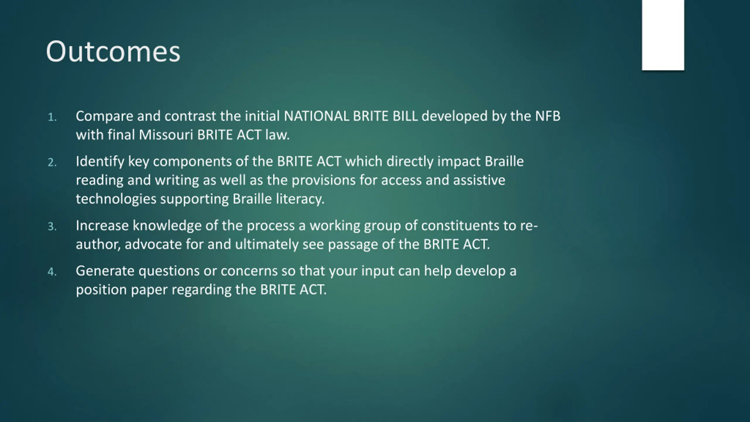Outcomes Compare and contrast the initial NATIONAL BRITE BILL developed by the NFB with final Missouri BRITE ACT law. 1. Identify key components of the BRITE ACT which directly impact Braille reading and writing as well as the provisions for access and assistive technologies supporting Braille literacy. 2. Increase knowledge of the process a working group of constituents to re- author, advocate for and ultimately see passage of the BRITE ACT. 3. Generate questions or concerns so that your input can help develop a position paper regarding the BRITE ACT. 4.