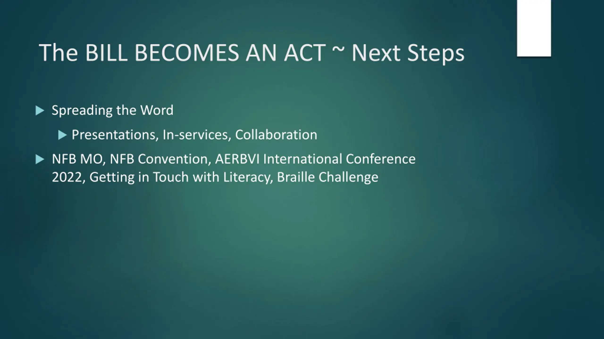 The BILL BECOMES AN ACT ~ Next Steps Spreading the Word Presentations, In-services, Collaboration NFB MO, NFB Convention, AERBVI International Conference 2022, Getting in Touch with Literacy, Braille Challenge