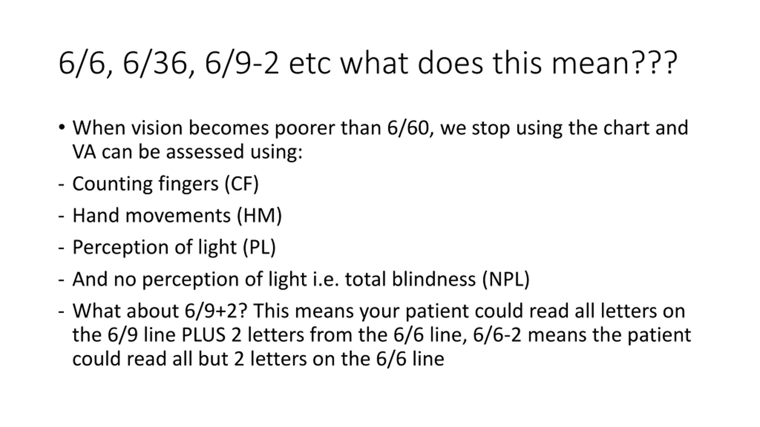 6/6, 6/36, 6/9-2 etc what does this mean??? When vision becomes poorer than 6/60, we stop using the chart and VA can be assessed using: - Counting fingers (CF) - Hand movements (HM) - Perception of light (PL) - And no perception of light i.e. total blindness (NPL) - What about 6/9+2? This means your patient could read all letters on the 6/9 line PLUS 2 letters from the 6/6 line, 6/6-2 means the patient could read all but 2 letters on the 6/6 line