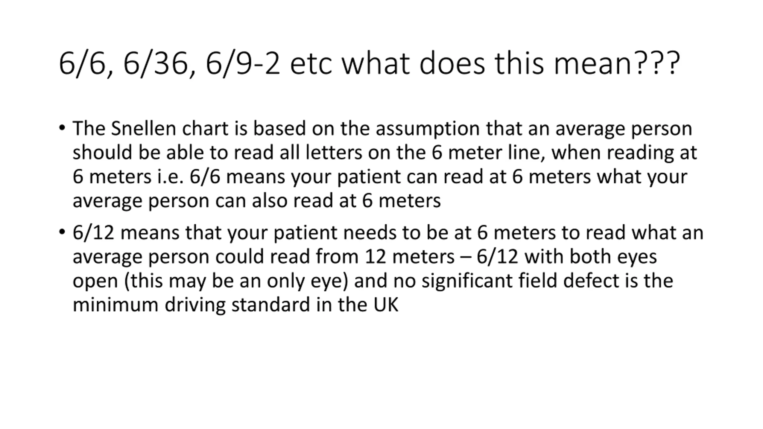 6/6, 6/36, 6/9-2 etc what does this mean??? The Snellen chart is based on the assumption that an average person should be able to read all letters on the 6 meter line, when reading at 6 meters i.e. 6/6 means your patient can read at 6 meters what your average person can also read at 6 meters 6/12 means that your patient needs to be at 6 meters to read what an average person could read from 12 meters 6/12 with both eyes open (this may be an only eye) and no significant field defect is the minimum driving standard in the UK