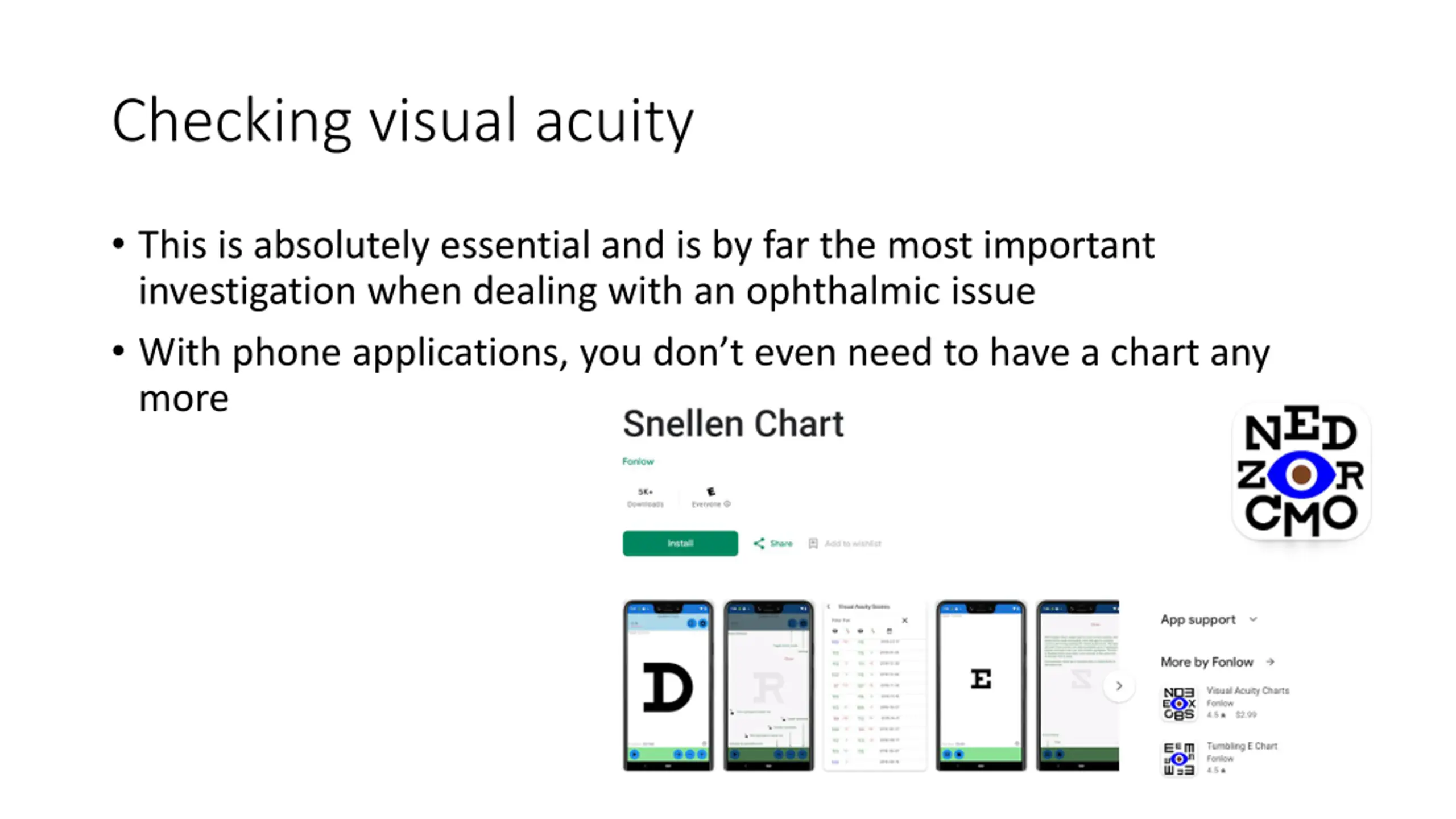 Checking visual acuity This is absolutely essential and is by far the most important investigation when dealing with an ophthalmic issue With phone applications, you don t even need to have a chart any more