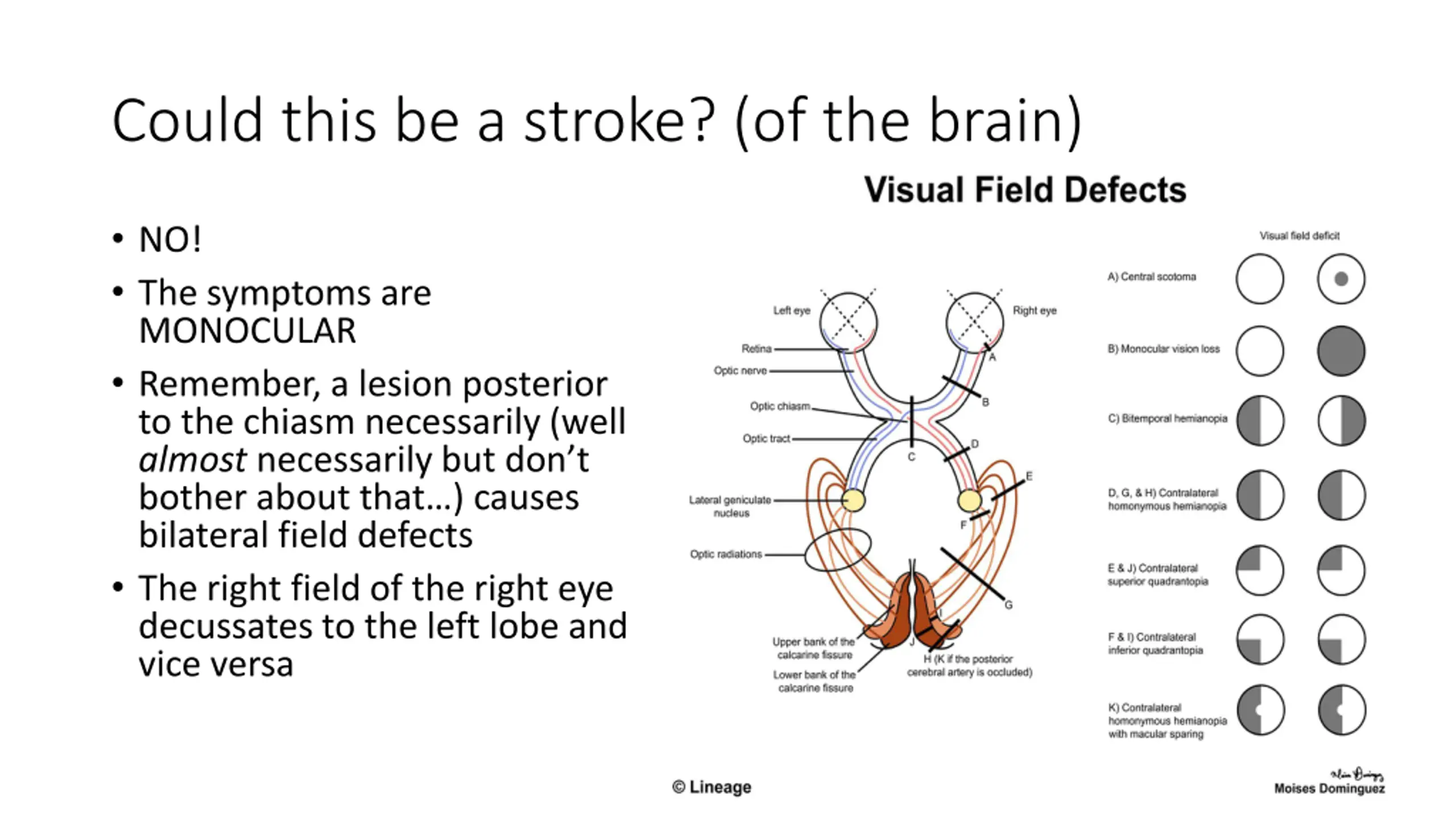 Could this be a stroke? (of the brain) NO! The symptoms are MONOCULAR Remember, a lesion posterior to the chiasm necessarily (well almost necessarily but don t bother about that ) causes bilateral field defects The right field of the right eye decussates to the left lobe and vice versa