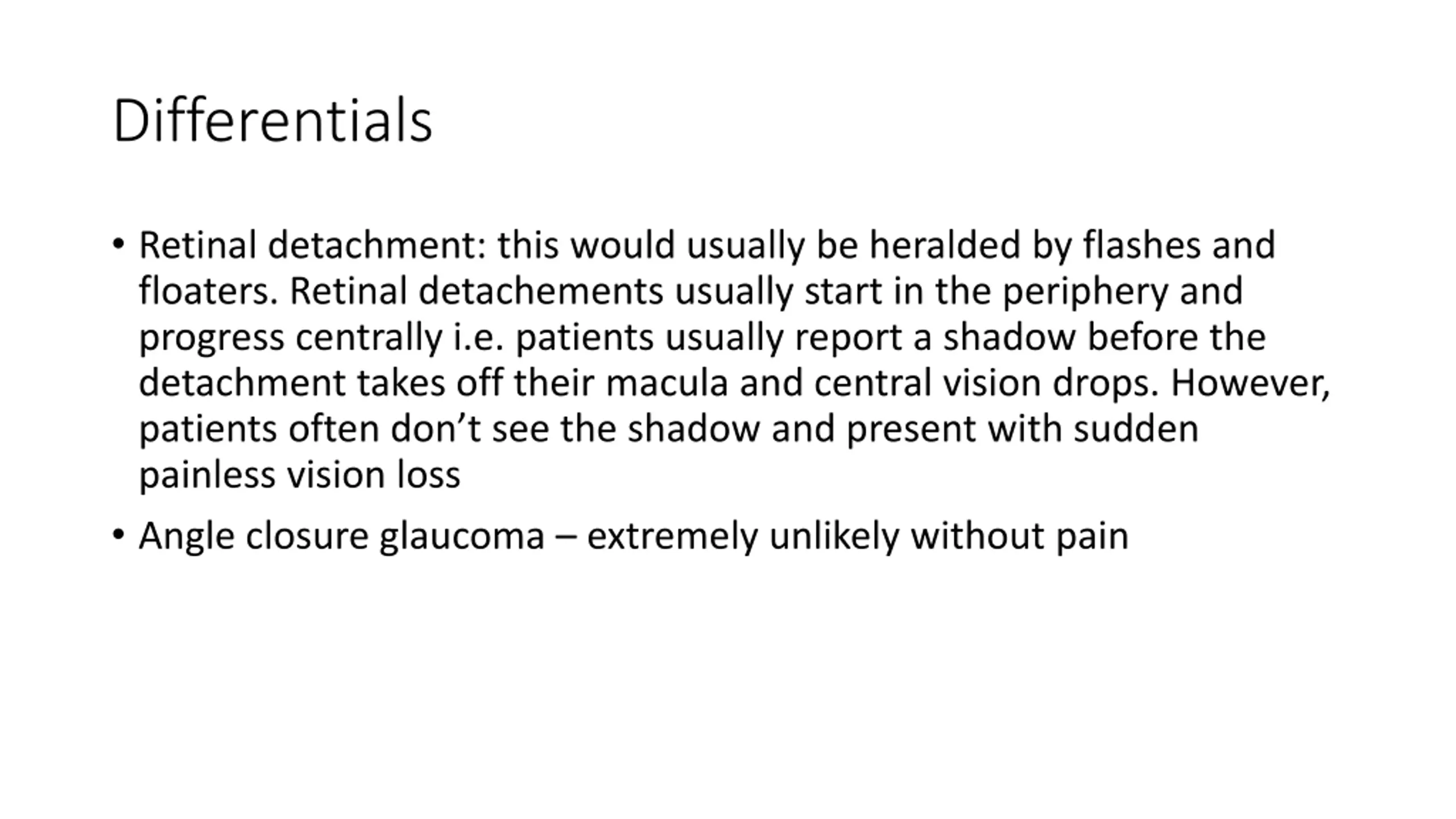 Differentials Retinal detachment: this would usually be heralded by flashes and floaters. Retinal detachements usually start in the periphery and progress centrally i.e. patients usually report a shadow before the detachment takes off their macula and central vision drops. However, patients often don t see the shadow and present with sudden painless vision loss Angle closure glaucoma extremely unlikely without pain