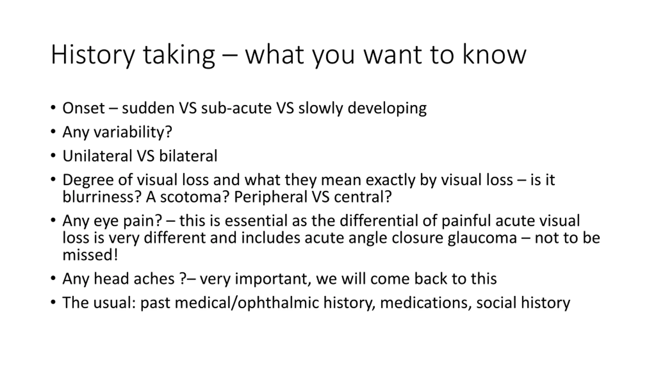 History taking what you want to know Onset sudden VS sub-acute VS slowly developing Any variability? Unilateral VS bilateral Degree of visual loss and what they mean exactly by visual loss is it blurriness? A scotoma? Peripheral VS central? Any eye pain? this is essential as the differential of painful acute visual loss is very different and includes acute angle closure glaucoma not to be missed! Any head aches ? very important, we will come back to this The usual: past medical/ophthalmic history, medications, social history