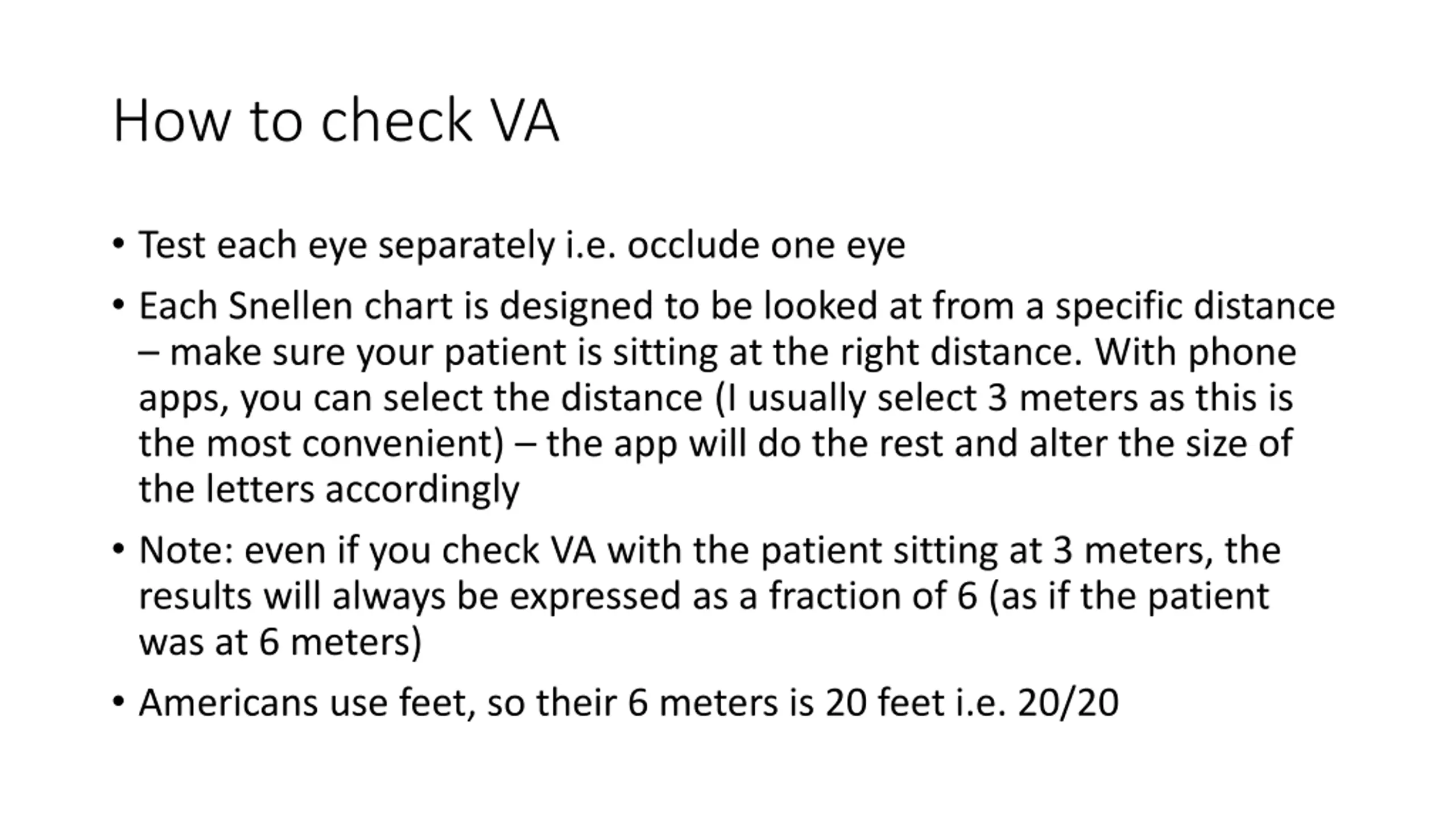 How to check VA Test each eye separately i.e. occlude one eye Each Snellen chart is designed to be looked at from a specific distance make sure your patient is sitting at the right distance. With phone apps, you can select the distance (I usually select 3 meters as this is the most convenient) the app will do the rest and alter the size of the letters accordingly Note: even if you check VA with the patient sitting at 3 meters, the results will always be expressed as a fraction of 6 (as if the patient was at 6 meters) Americans use feet, so their 6 meters is 20 feet i.e. 20/20