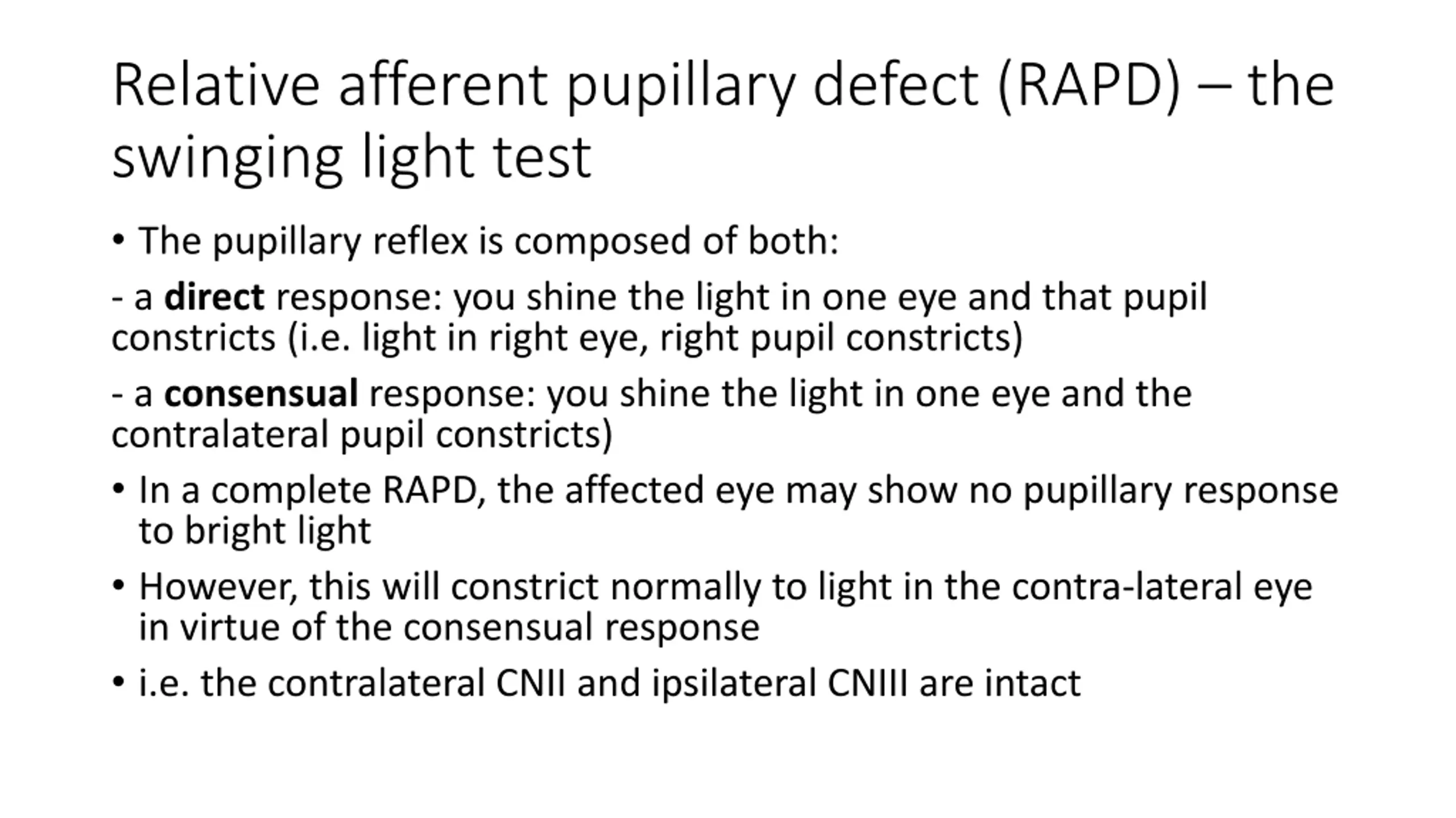 Relative afferent pupillary defect (RAPD) the swinging light test The pupillary reflex is composed of both: - a direct response: you shine the light in one eye and that pupil constricts (i.e. light in right eye, right pupil constricts) - a consensual response: you shine the light in one eye and the contralateral pupil constricts) In a complete RAPD, the affected eye may show no pupillary response to bright light However, this will constrict normally to light in the contra-lateral eye in virtue of the consensual response i.e. the contralateral CNII and ipsilateral CNIII are intact