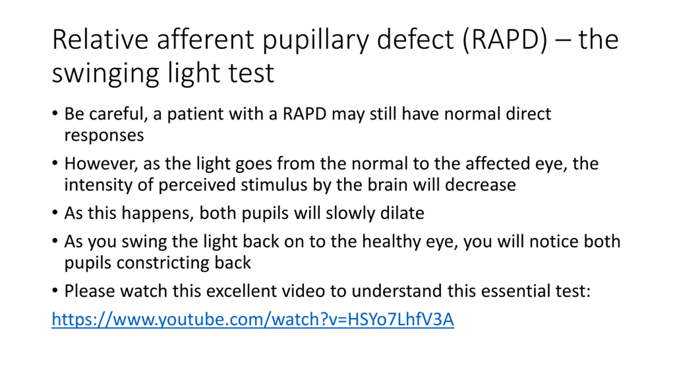 Relative afferent pupillary defect (RAPD) the swinging light test Be careful, a patient with a RAPD may still have normal direct responses However, as the light goes from the normal to the affected eye, the intensity of perceived stimulus by the brain will decrease As this happens, both pupils will slowly dilate As you swing the light back on to the healthy eye, you will notice both pupils constricting back Please watch this excellent video to understand this essential test: https://www.youtube.com/watch?v=HSYo7LhfV3A