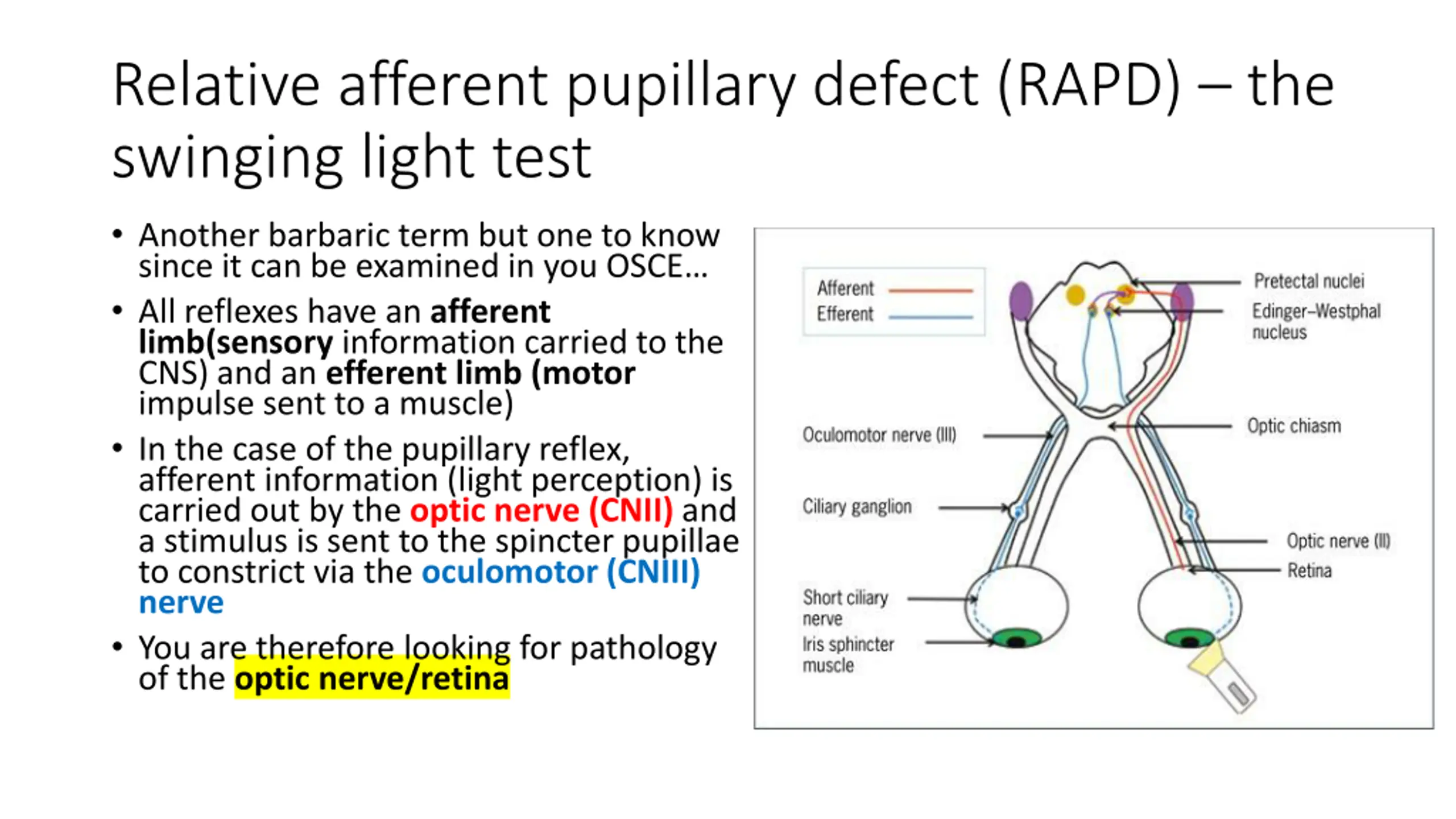 Relative afferent pupillary defect (RAPD) the swinging light test Another barbaric term but one to know since it can be examined in you OSCE All reflexes have an afferent limb(sensory information carried to the CNS) and an efferent limb (motor impulse sent to a muscle) In the case of the pupillary reflex, afferent information (light perception) is carried out by the optic nerve (CNII) and a stimulus is sent to the spincter pupillae to constrict via the oculomotor (CNIII) nerve You are therefore looking for pathology of the optic nerve/retina
