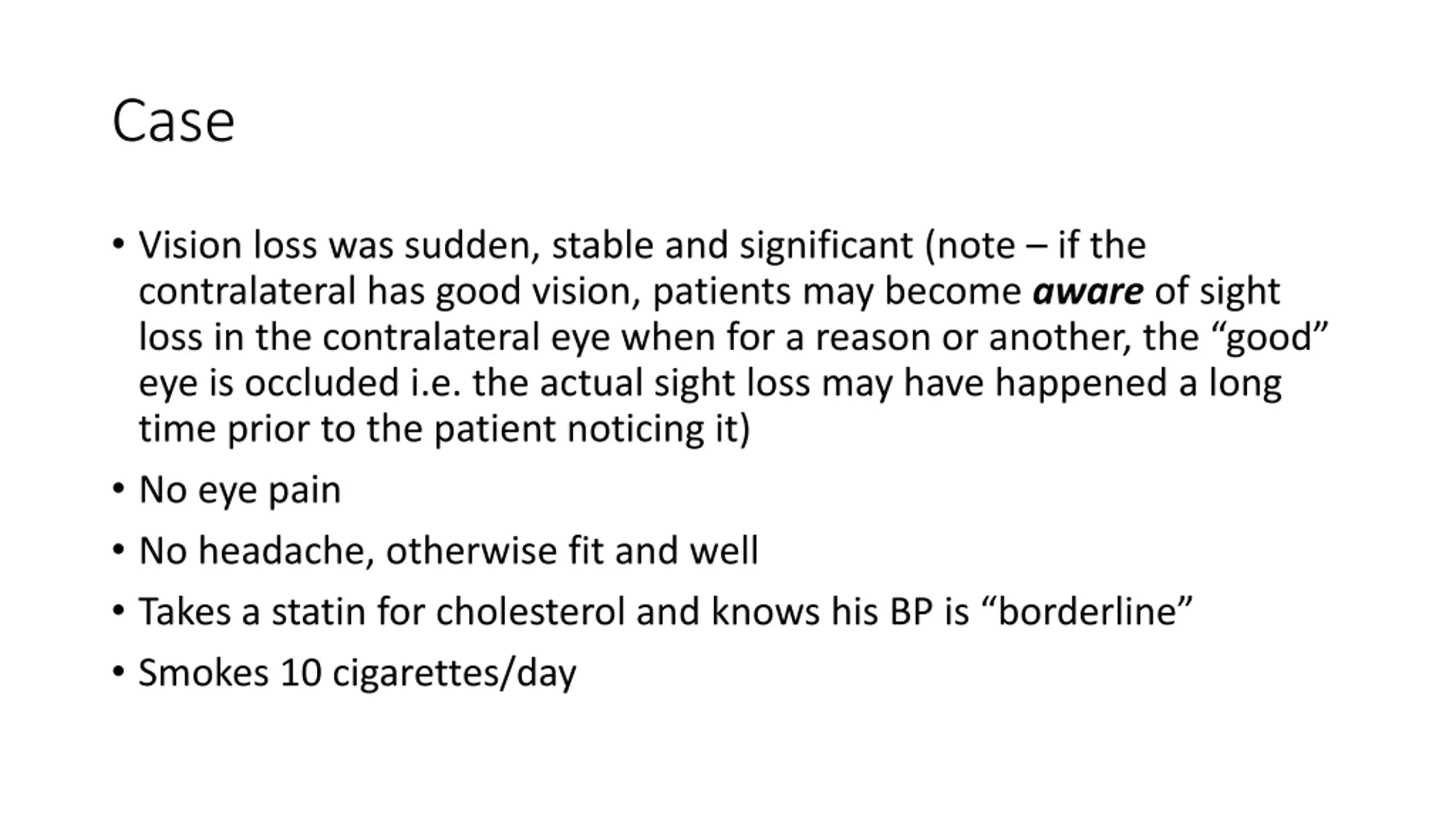 Case Vision loss was sudden, stable and significant (note if the contralateral has good vision, patients may become aware of sight loss in the contralateral eye when for a reason or another, the good eye is occluded i.e. the actual sight loss may have happened a long time prior to the patient noticing it) No eye pain No headache, otherwise fit and well Takes a statin for cholesterol and knows his BP is borderline Smokes 10 cigarettes/day