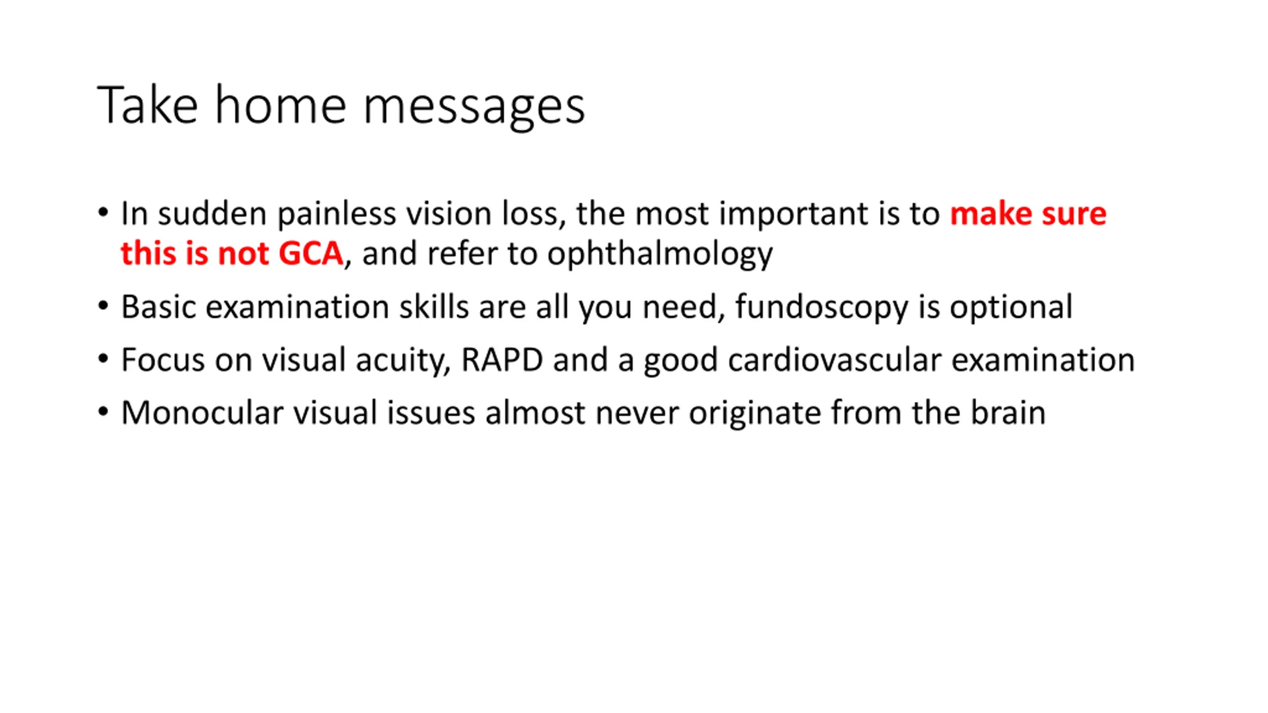 Take home messages In sudden painless vision loss, the most important is to make sure this is not GCA, and refer to ophthalmology Basic examination skills are all you need, fundoscopy is optional Focus on visual acuity, RAPD and a good cardiovascular examination Monocular visual issues almost never originate from the brain