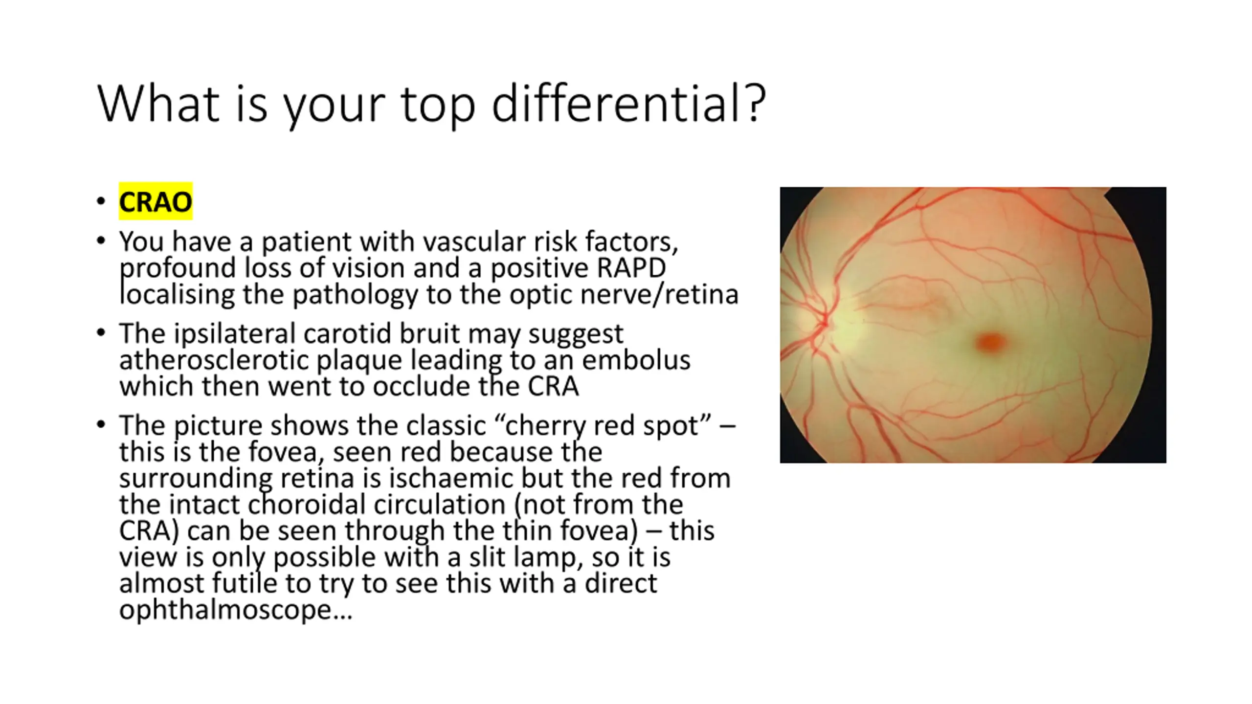 What is your top differential? CRAO You have a patient with vascular risk factors, profound loss of vision and a positive RAPD localising the pathology to the optic nerve/retina The ipsilateral carotid bruit may suggest atherosclerotic plaque leading to an embolus which then went to occlude the CRA The picture shows the classic cherry red spot this is the fovea, seen red because the surrounding retina is ischaemic but the red from the intact choroidal circulation (not from the CRA) can be seen through the thin fovea) this view is only possible with a slit lamp, so it is almost futile to try to see this with a direct ophthalmoscope