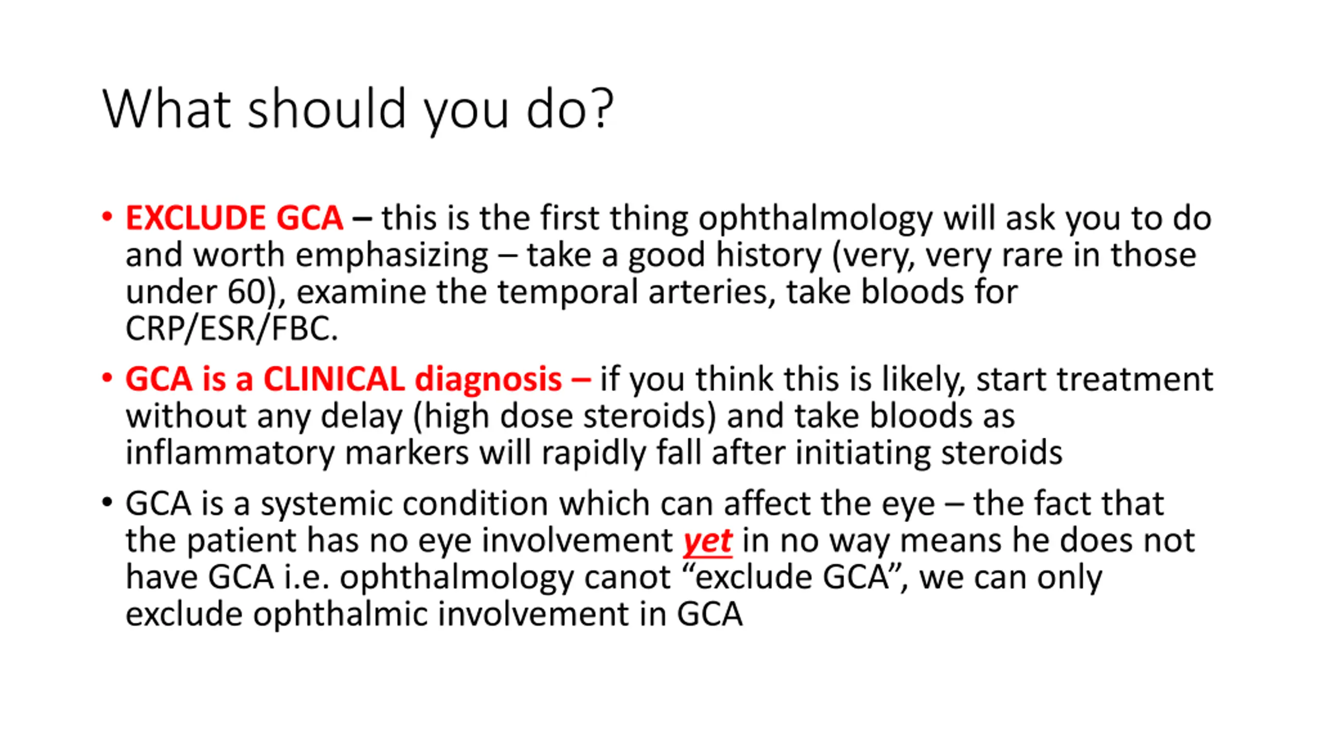 What should you do? EXCLUDE GCA this is the first thing ophthalmology will ask you to do and worth emphasizing take a good history (very, very rare in those under 60), examine the temporal arteries, take bloods for CRP/ESR/FBC. GCA is a CLINICAL diagnosis if you think this is likely, start treatment without any delay (high dose steroids) and take bloods as inflammatory markers will rapidly fall after initiating steroids GCA is a systemic condition which can affect the eye the fact that the patient has no eye involvement yet in no way means he does not have GCA i.e. ophthalmology canot exclude GCA , we can only exclude ophthalmic involvement in GCA