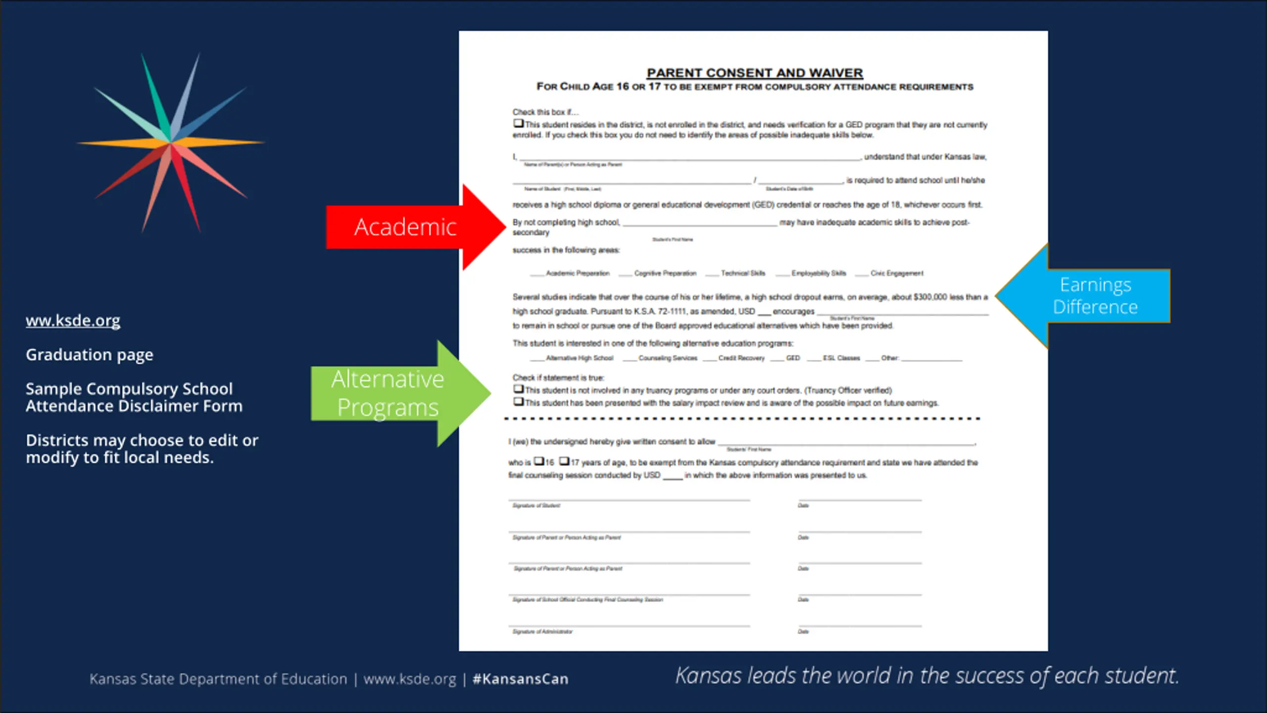 Academic Earnings Difference ww.ksde.org Graduation page Alternative Programs Sample Compulsory School Attendance Disclaimer Form Districts may choose to edit or modify to fit local needs.