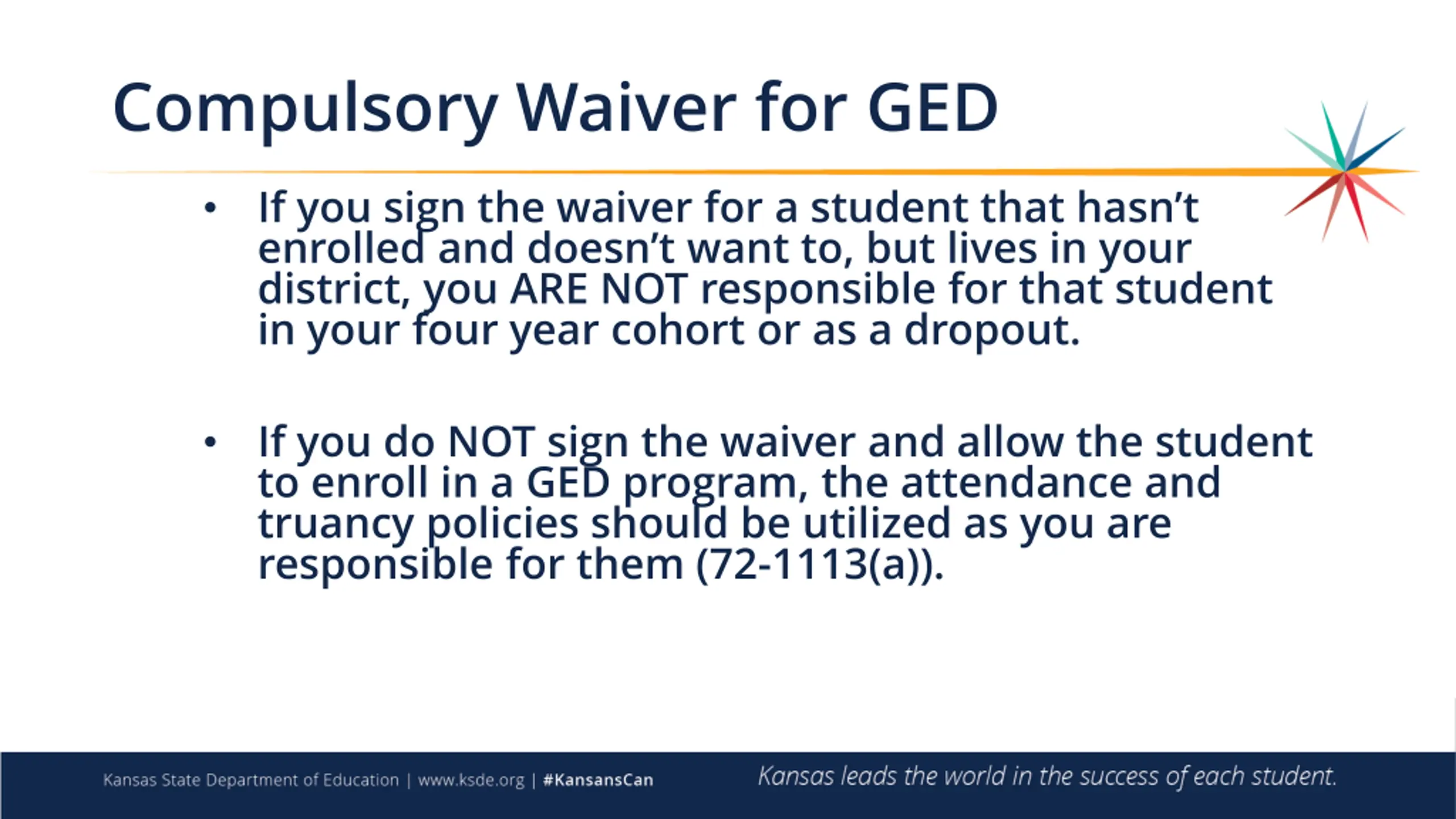 Compulsory Waiver for GED If you sign the waiver for a student that hasn t enrolled and doesn t want to, but lives in your district, you ARE NOT responsible for that student in your four year cohort or as a dropout. If you do NOT sign the waiver and allow the student to enroll in a GED program, the attendance and truancy policies should be utilized as you are responsible for them (72-1113(a)).