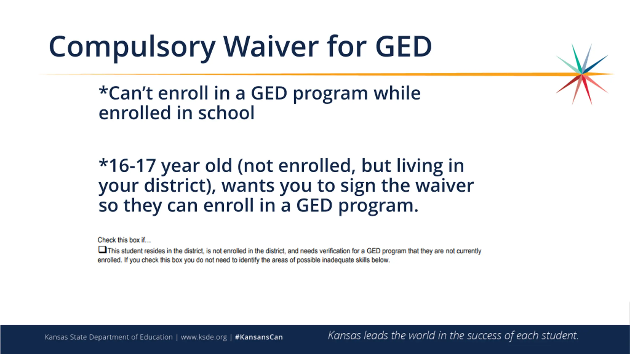 Compulsory Waiver for GED *Can t enroll in a GED program while enrolled in school *16-17 year old (not enrolled, but living in your district), wants you to sign the waiver so they can enroll in a GED program.