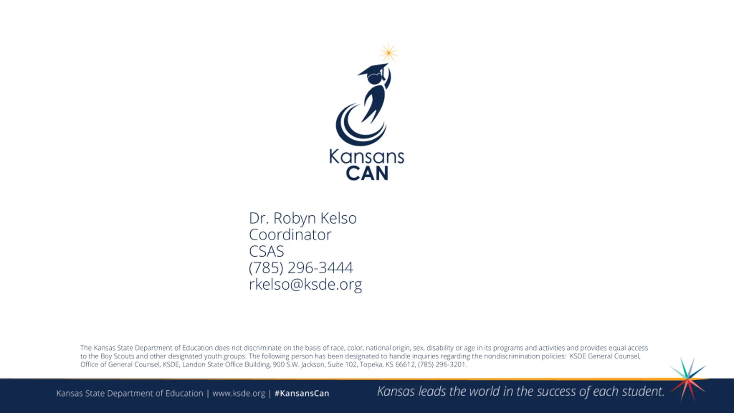 Dr. Robyn Kelso Coordinator CSAS (785) 296-3444 rkelso@ksde.org The Kansas State Department of Education does not discriminate on the basis of race, color, national origin, sex, disability or age in its programs and activities and provides equal access to the Boy Scouts and other designated youth groups. The following person has been designated to handle inquiries regarding the nondiscrimination policies: KSDE General Counsel, Office of General Counsel, KSDE, Landon State Office Building, 900 S.W. Jackson, Suite 102, Topeka, KS 66612, (785) 296-3201.