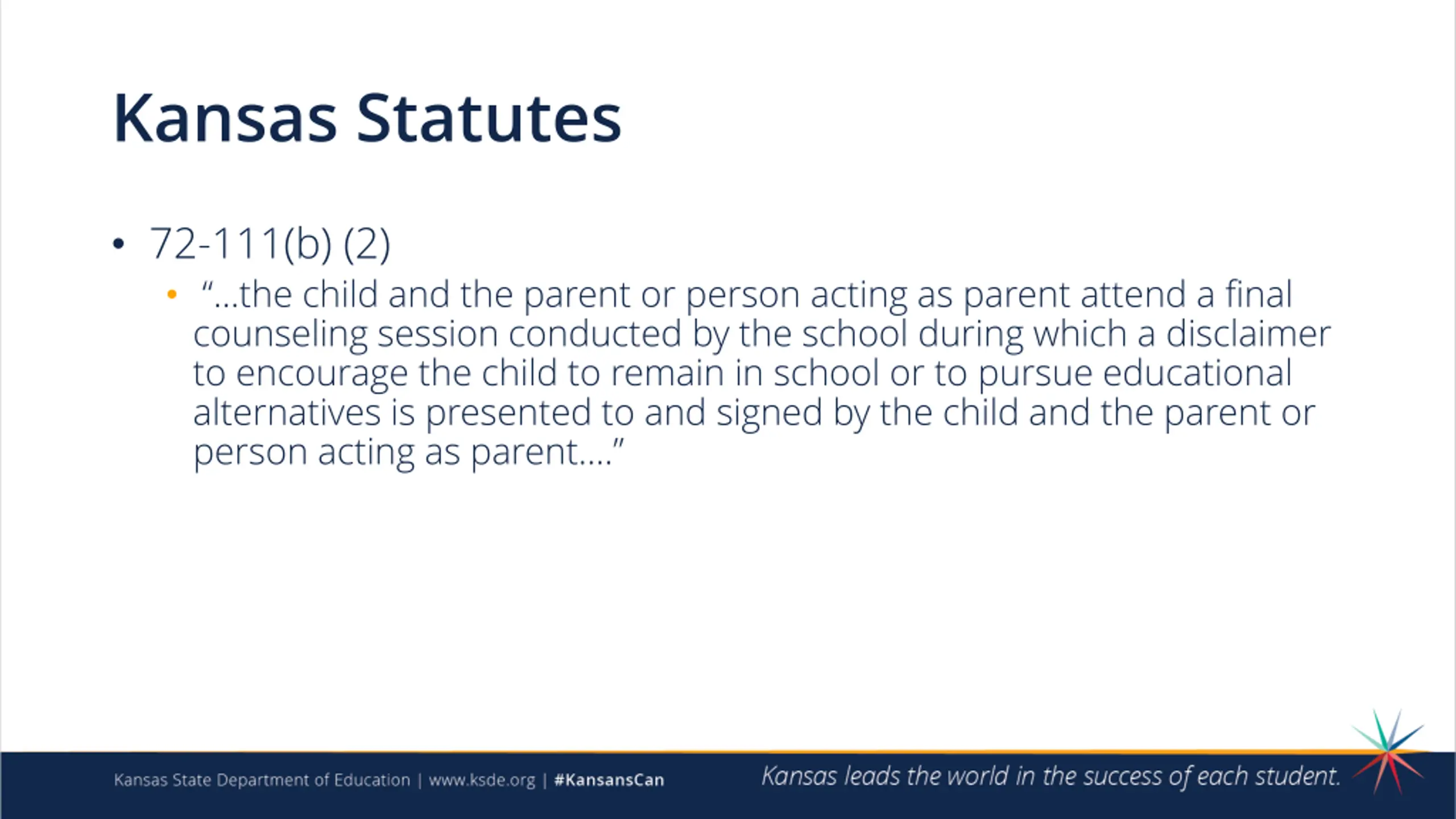 Kansas Statutes 72-111(b) (2) the child and the parent or person acting as parent attend a final counseling session conducted by the school during which a disclaimer to encourage the child to remain in school or to pursue educational alternatives is presented to and signed by the child and the parent or person acting as parent.