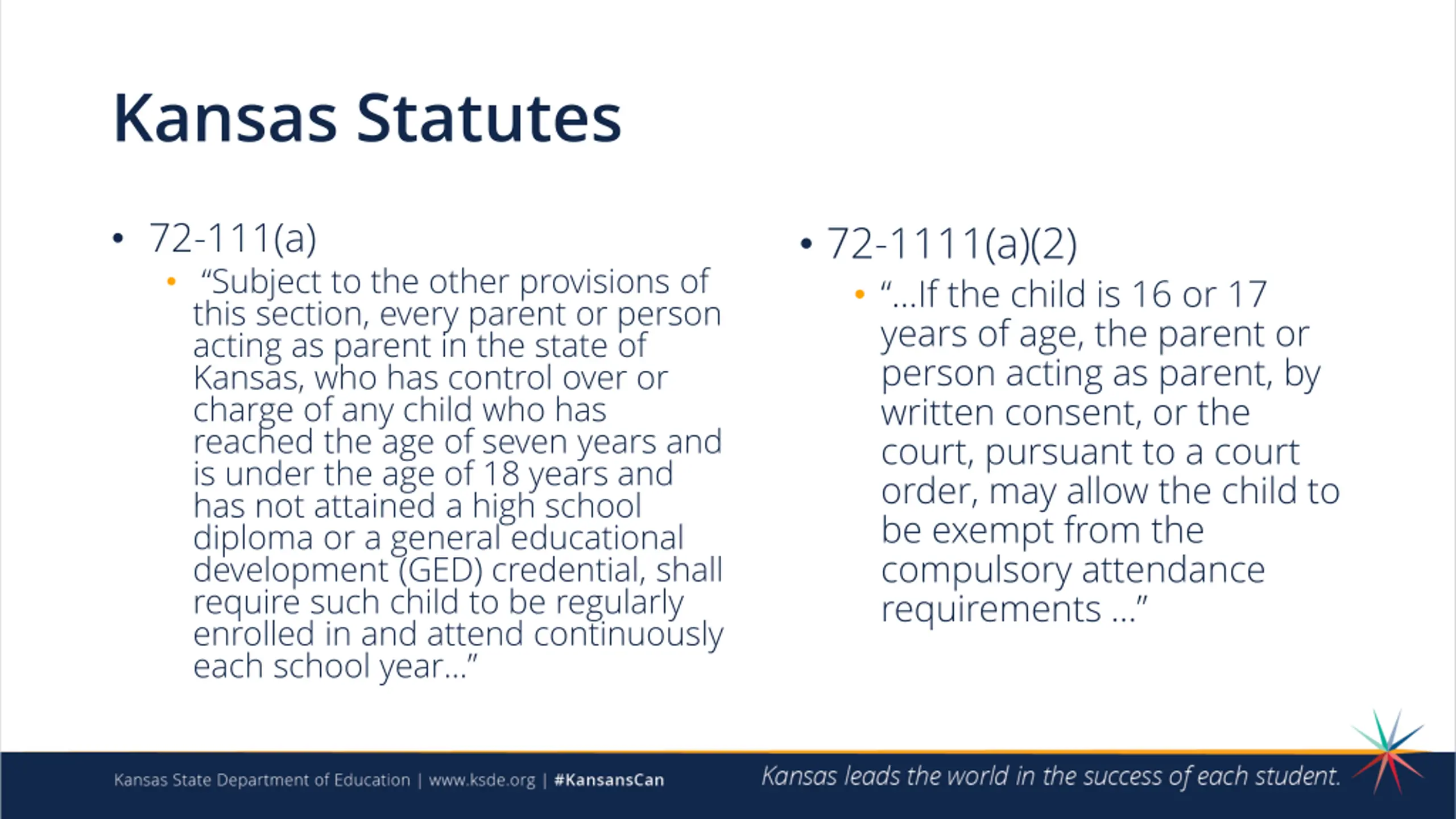 Kansas Statutes 72-111(a) Subject to the other provisions of this section, every parent or person acting as parent in the state of Kansas, who has control over or charge of any child who has reached the age of seven years and is under the age of 18 years and has not attained a high school diploma or a general educational development (GED) credential, shall require such child to be regularly enrolled in and attend continuously each school year 72-1111(a)(2) If the child is 16 or 17 years of age, the parent or person acting as parent, by written consent, or the court, pursuant to a court order, may allow the child to be exempt from the compulsory attendance requirements