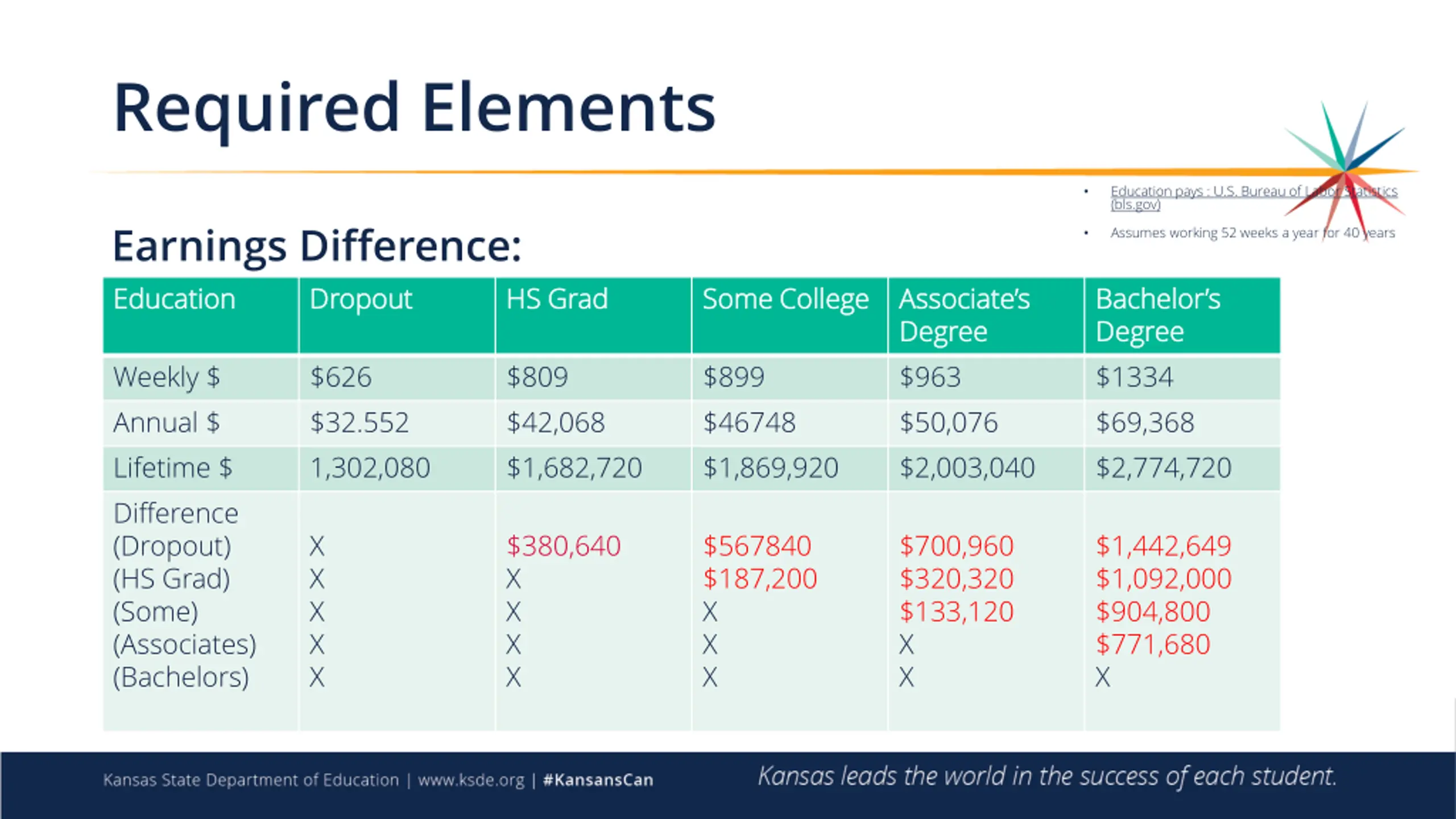Required Elements Education pays : U.S. Bureau of Labor Statistics (bls.gov) Earnings Difference: Education Education Dropout Dropout Assumes working 52 weeks a year for 40 years HS Grad HS Grad Some College Some College Associate s Associate s Degree Degree $963 $50,076 $2,003,040 Bachelor s Bachelor s Degree Degree $1334 $69,368 $2,774,720 Weekly $ Annual $ Lifetime $ Difference (Dropout) (HS Grad) (Some) (Associates) (Bachelors) $626 $32.552 1,302,080 $809 $42,068 $1,682,720 $899 $46748 $1,869,920 X X X X X $380,640 X X X X $567840 $187,200 X X X $700,960 $320,320 $133,120 X X $1,442,649 $1,092,000 $904,800 $771,680 X
