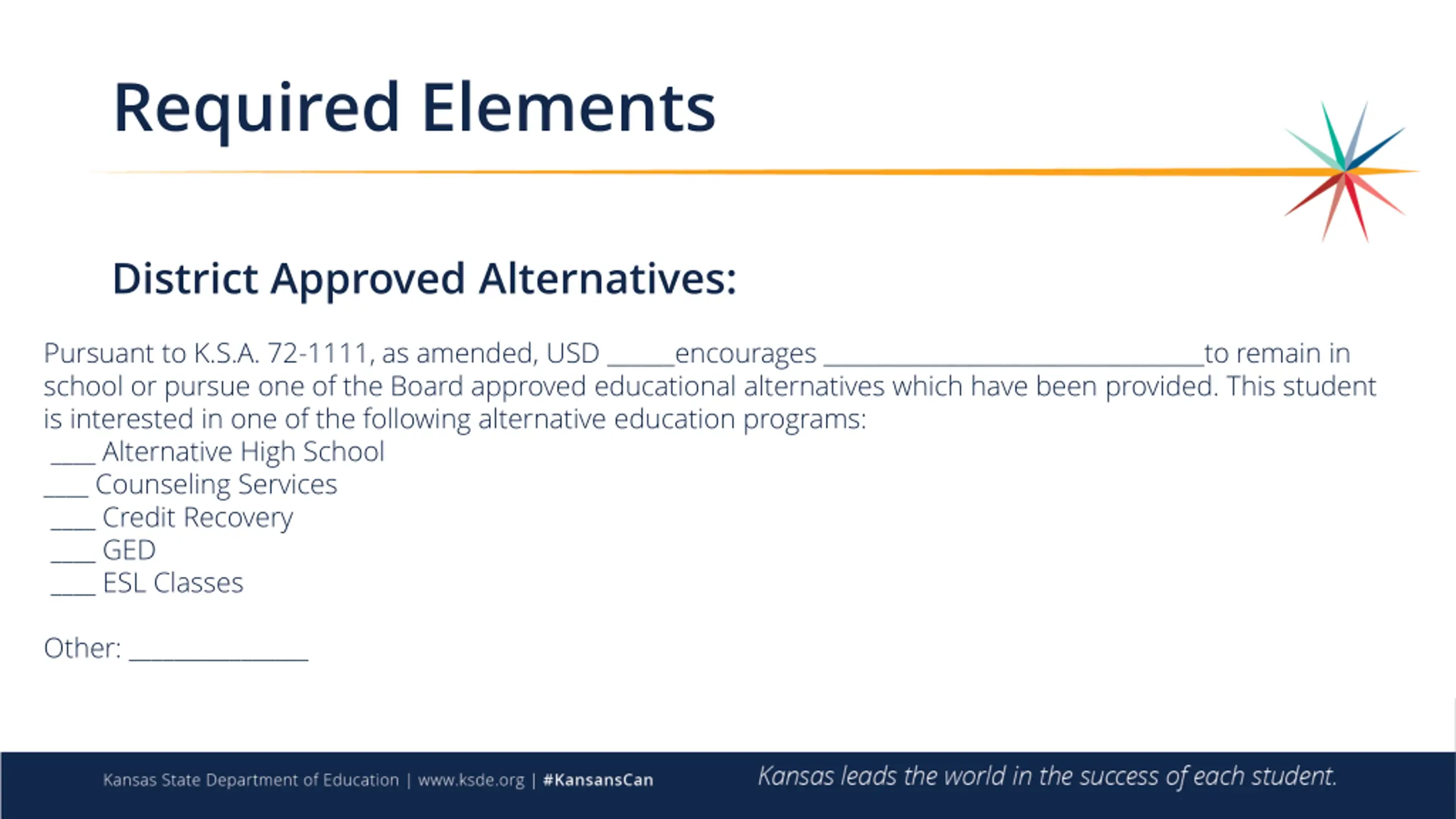 Required Elements District Approved Alternatives: Pursuant to K.S.A. 72-1111, as amended, USD ______encourages __________________________________to remain in school or pursue one of the Board approved educational alternatives which have been provided. This student is interested in one of the following alternative education programs: ____ Alternative High School ____ Counseling Services ____ Credit Recovery ____ GED ____ ESL Classes Other: ________________