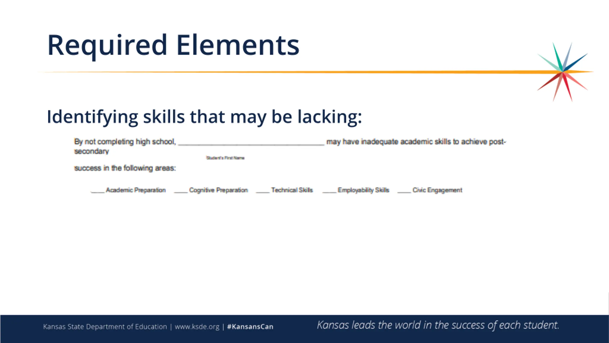Counseling Session Requirements 72-1111 (b) (2) Required Elements Information regarding the academic skills that the student has not yet achieved. Difference between future earnings of a high school graduate versus a dropout. District approved educational alternatives