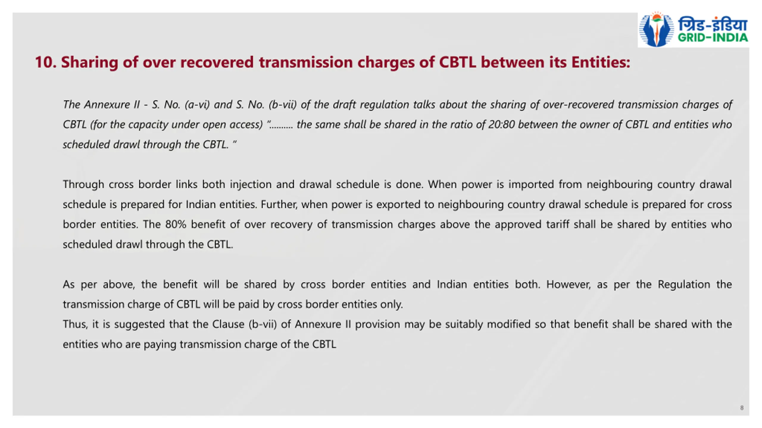 10. Sharing of over recovered transmission charges of CBTL between its Entities: The Annexure II - S. No. (a-vi) and S. No. (b-vii) of the draft regulation talks about the sharing of over-recovered transmission charges of CBTL (for the capacity under open access) .......... the same shall be shared in the ratio of 20:80 between the owner of CBTL and entities who scheduled drawl through the CBTL. Through cross border links both injection and drawal schedule is done. When power is imported from neighbouring country drawal schedule is prepared for Indian entities. Further, when power is exported to neighbouring country drawal schedule is prepared for cross border entities. The 80% benefit of over recovery of transmission charges above the approved tariff shall be shared by entities who scheduled drawl through the CBTL. As per above, the benefit will be shared by cross border entities and Indian entities both. However, as per the Regulation the transmission charge of CBTL will be paid by cross border entities only. Thus, it is suggested that the Clause (b-vii) of Annexure II provision may be suitably modified so that benefit shall be shared with the entities who are paying transmission charge of the CBTL 8