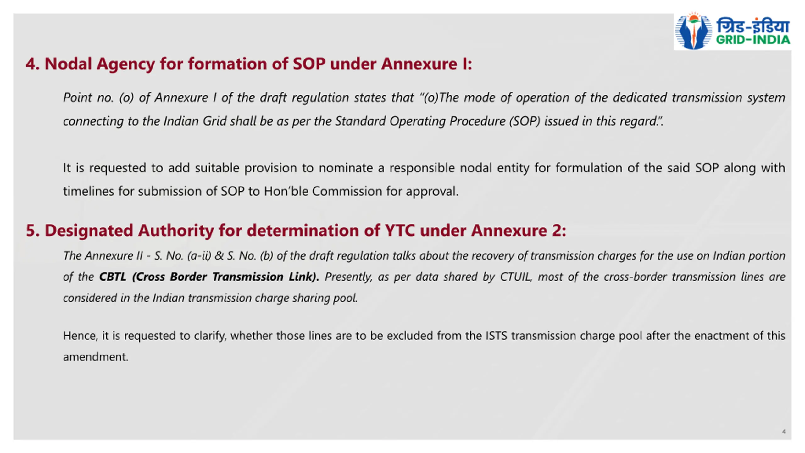 4. Nodal Agency for formation of SOP under Annexure I: Point no. (o) of Annexure I of the draft regulation states that (o)The mode of operation of the dedicated transmission system connecting to the Indian Grid shall be as per the Standard Operating Procedure (SOP) issued in this regard. . It is requested to add suitable provision to nominate a responsible nodal entity for formulation of the said SOP along with timelines for submission of SOP to Hon ble Commission for approval. 5. Designated Authority for determination of YTC under Annexure 2: The Annexure II - S. No. (a-ii) & S. No. (b) of the draft regulation talks about the recovery of transmission charges for the use on Indian portion of the CBTL (Cross Border Transmission Link). Presently, as per data shared by CTUIL, most of the cross-border transmission lines are considered in the Indian transmission charge sharing pool. Hence, it is requested to clarify, whether those lines are to be excluded from the ISTS transmission charge pool after the enactment of this amendment. 4