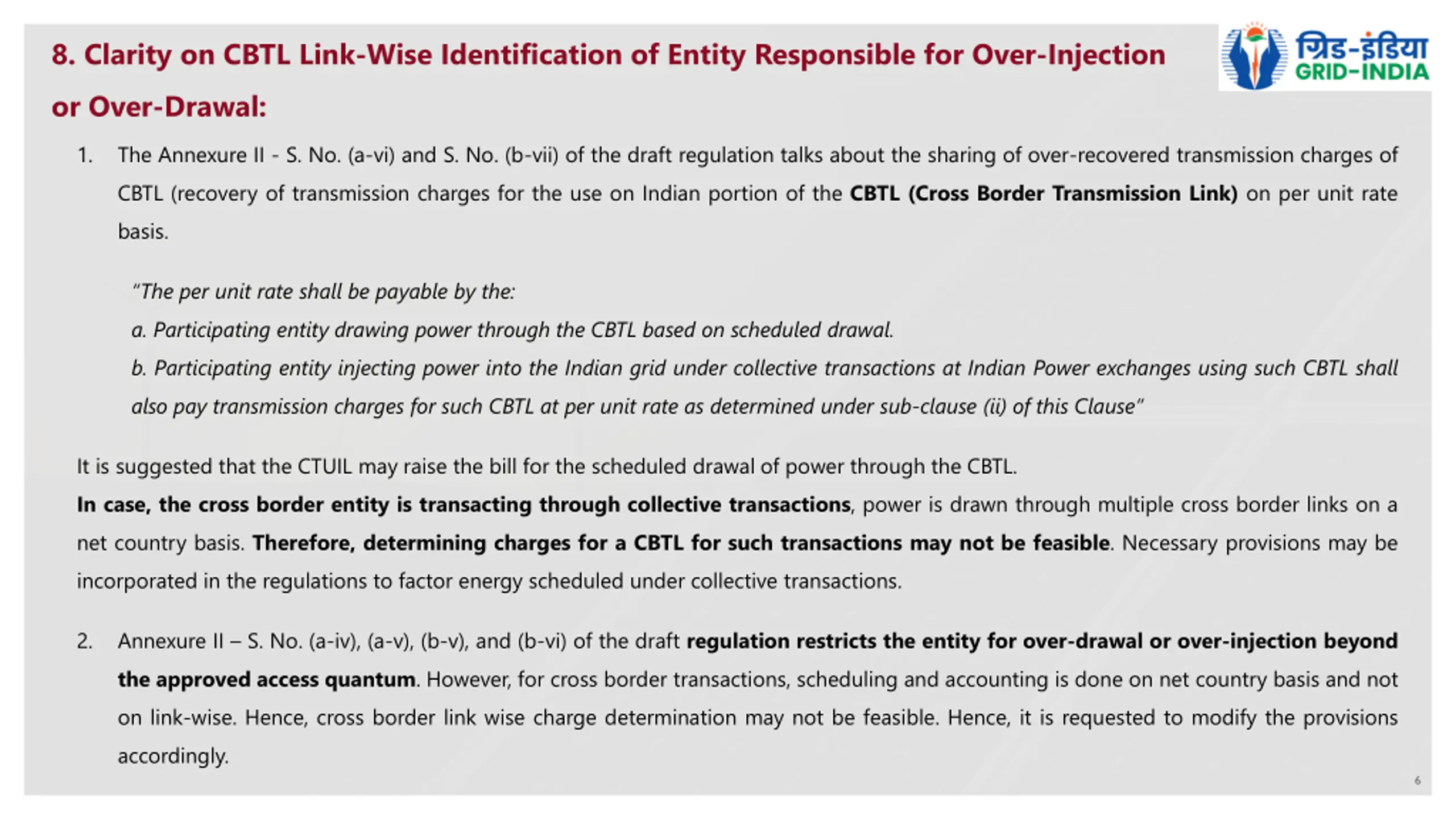 8. Clarity on CBTL Link-Wise Identification of Entity Responsible for Over-Injection or Over-Drawal: 1. The Annexure II - S. No. (a-vi) and S. No. (b-vii) of the draft regulation talks about the sharing of over-recovered transmission charges of CBTL (recovery of transmission charges for the use on Indian portion of the CBTL (Cross Border Transmission Link) on per unit rate basis. The per unit rate shall be payable by the: a. Participating entity drawing power through the CBTL based on scheduled drawal. b. Participating entity injecting power into the Indian grid under collective transactions at Indian Power exchanges using such CBTL shall also pay transmission charges for such CBTL at per unit rate as determined under sub-clause (ii) of this Clause It is suggested that the CTUIL may raise the bill for the scheduled drawal of power through the CBTL. In case, the cross border entity is transacting through collective transactions, power is drawn through multiple cross border links on a net country basis. Therefore, determining charges for a CBTL for such transactions may not be feasible. Necessary provisions may be incorporated in the regulations to factor energy scheduled under collective transactions. 2. Annexure II S. No. (a-iv), (a-v), (b-v), and (b-vi) of the draft regulation restricts the entity for over-drawal or over-injection beyond the approved access quantum. However, for cross border transactions, scheduling and accounting is done on net country basis and not on link-wise. Hence, cross border link wise charge determination may not be feasible. Hence, it is requested to modify the provisions accordingly. 6