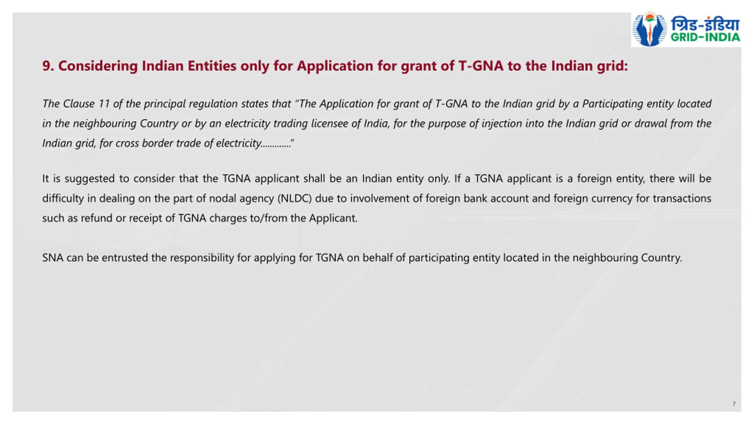 9. Considering Indian Entities only for Application for grant of T-GNA to the Indian grid: The Clause 11 of the principal regulation states that The Application for grant of T-GNA to the Indian grid by a Participating entity located in the neighbouring Country or by an electricity trading licensee of India, for the purpose of injection into the Indian grid or drawal from the Indian grid, for cross border trade of electricity............. It is suggested to consider that the TGNA applicant shall be an Indian entity only. If a TGNA applicant is a foreign entity, there will be difficulty in dealing on the part of nodal agency (NLDC) due to involvement of foreign bank account and foreign currency for transactions such as refund or receipt of TGNA charges to/from the Applicant. SNA can be entrusted the responsibility for applying for TGNA on behalf of participating entity located in the neighbouring Country. 7