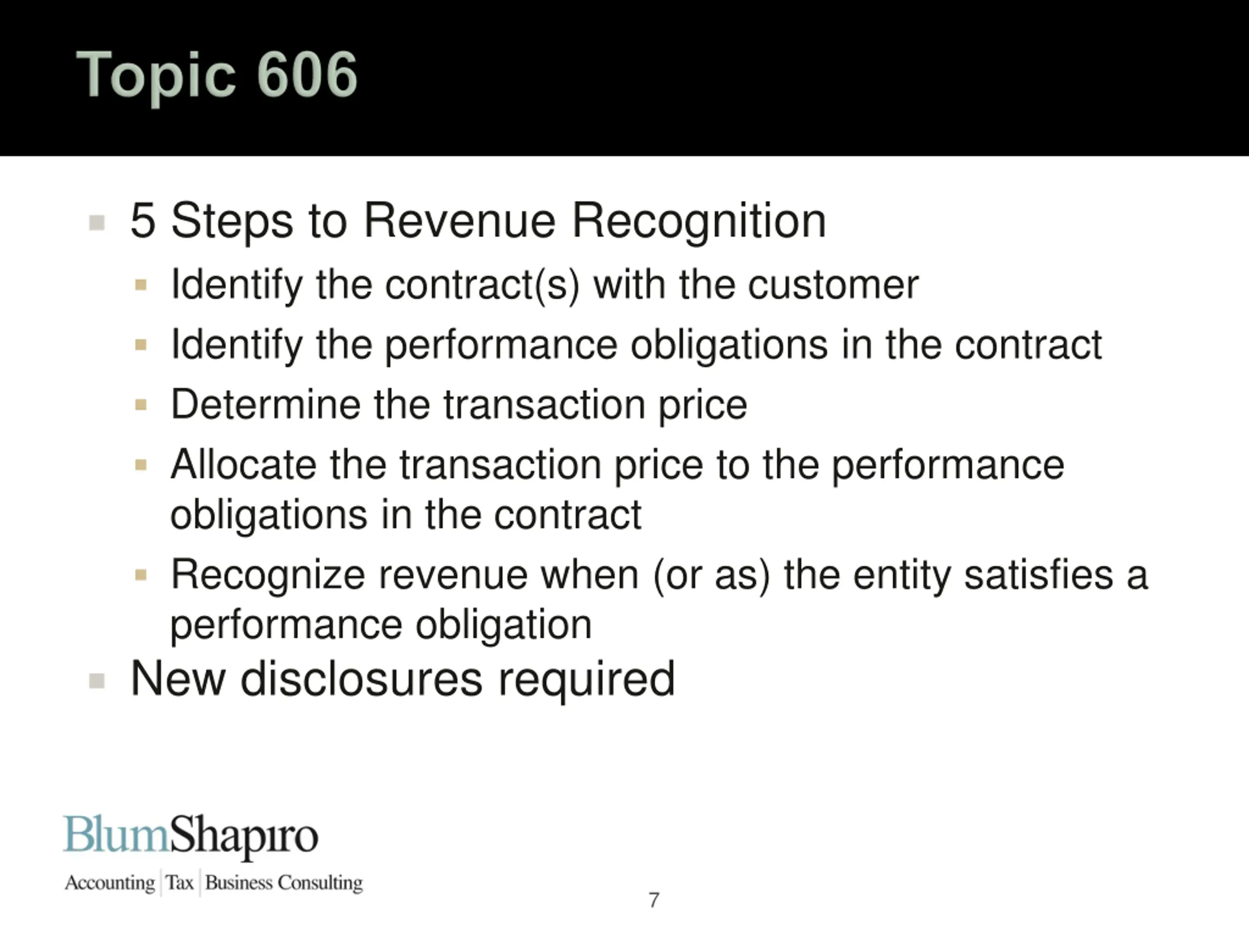 5 Steps to Revenue Recognition Identify the contract(s) with the customer Identify the performance obligations in the contract Determine the transaction price Allocate the transaction price to the performance obligations in the contract Recognize revenue when (or as) the entity satisfies a performance obligation New disclosures required 7