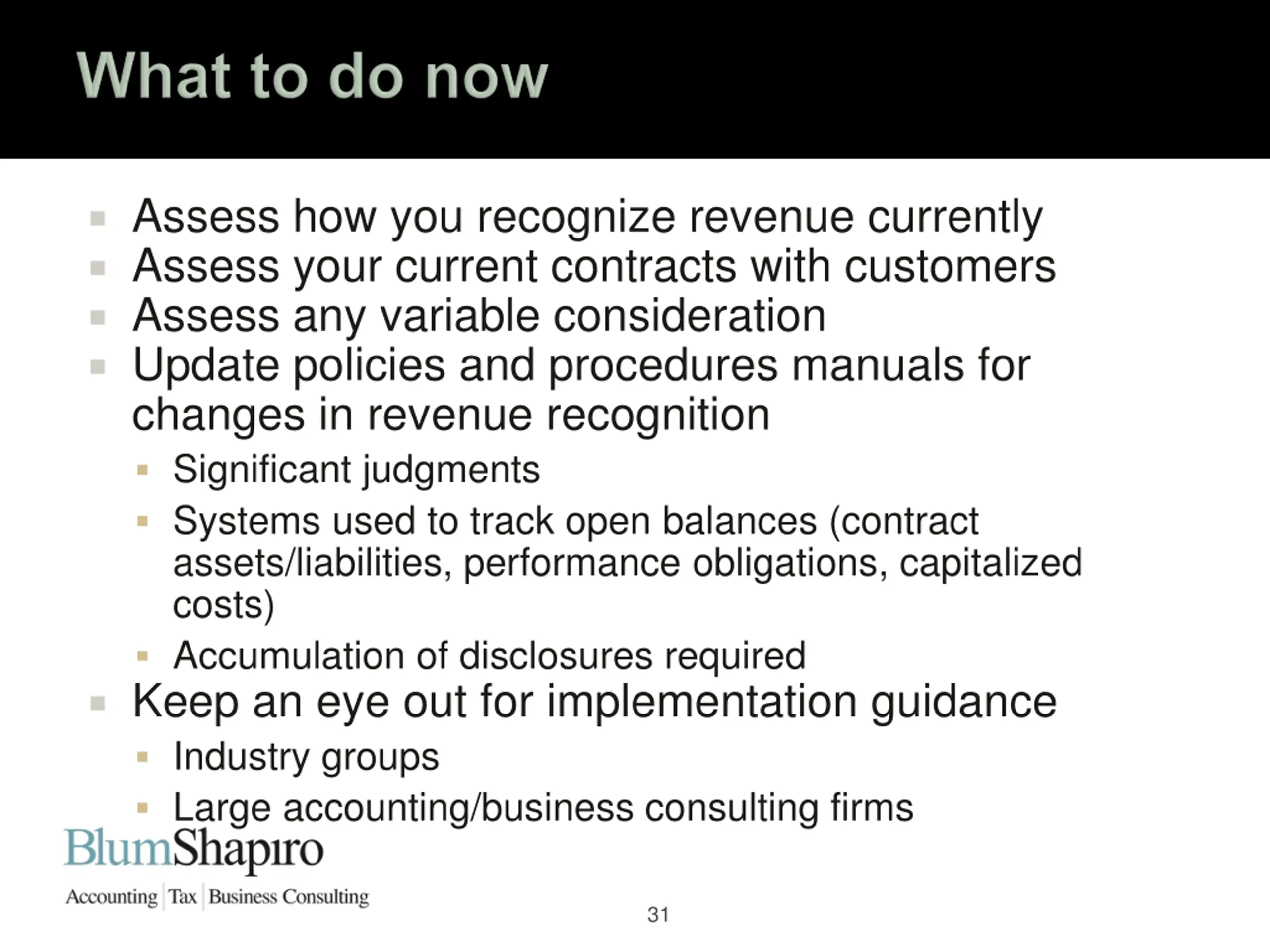 Assess how you recognize revenue currently Assess your current contracts with customers Assess any variable consideration Update policies and procedures manuals for changes in revenue recognition Significant judgments Systems used to track open balances (contract assets/liabilities, performance obligations, capitalized costs) Accumulation of disclosures required Keep an eye out for implementation guidance Industry groups Large accounting/business consulting firms 31